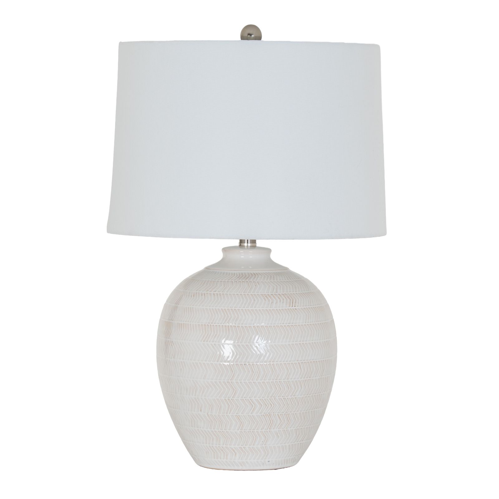 Distinguished by its layered chevron motif and gentle linen shade, the Chevronne Ceramic Table Lamp stands as an expressive accent within the wider Ceramic Collection, merging pattern and texture into a cohesive statement piece. Its glazed ceramic base presents a tactile interplay of depth and light, the rhythmic zigzag relief catching shadows through the day while the warm-toned linen shade diffuses a pleasantly balanced glow. The geometric surface treatment carries both a sense of structure and fluidity, making it effortlessly suited to both modern and transitional interior schemes. Subtle glaze variations give each lamp a measure of individuality, introducing a sense of artisanal authenticity that supports premium retail positioning. For trade stockists, the lamps strong visual identity ensures it remains a stand-out item in displays, particularly when contrasted with smooth-surfaced accessories from the same Ceramic Collection.