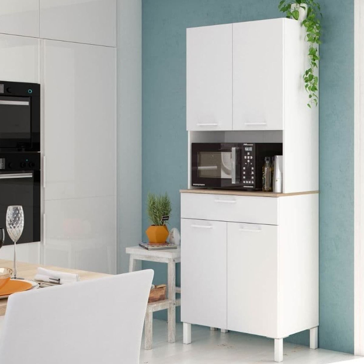 The Chris Kitchen utility cupboard in white with oak effect worktops. This cupboard features 4 doors, 1 drawer and a hutch perfect to store your microwave.