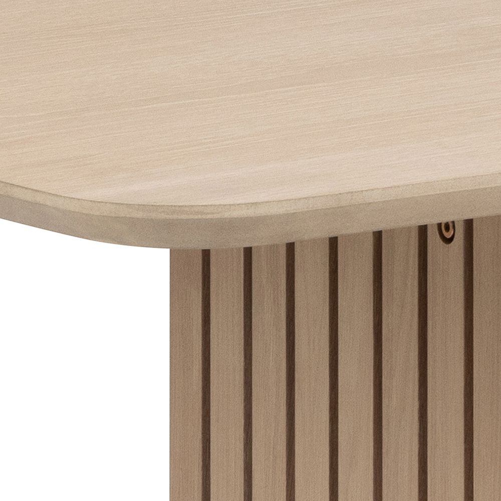 Delight in the modern craftsmanship of this rectangular dining table, which showcases a top and base finished in oak lacquered veneer. The base, also in oak NC lacquered veneer, features a distinctive lamella design, offering a blend of contemporary design and classic warmth to any dining setting.