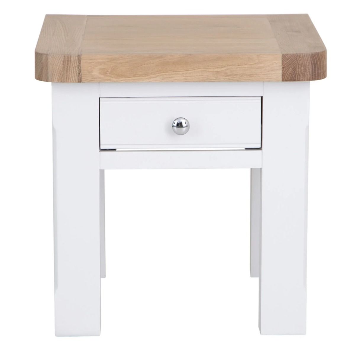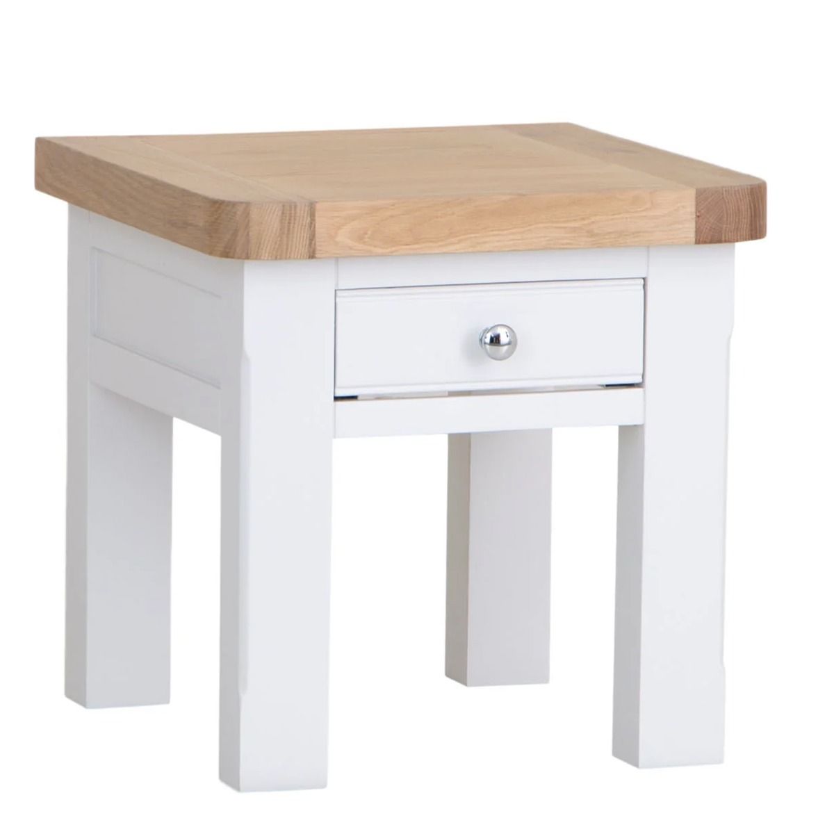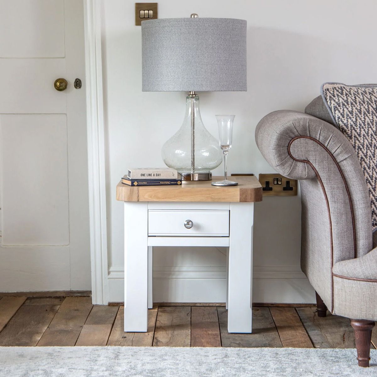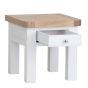 Introducing our Lamp Table, a versatile and stylish addition to your living space. Featuring a single drawer with a sleek chrome handle, this table offers convenient storage for your essentials while adding a touch of modern elegance. The chunky oak top with rounded corners adds durability and charm, making it the perfect spot for your lamp or decorative items.
