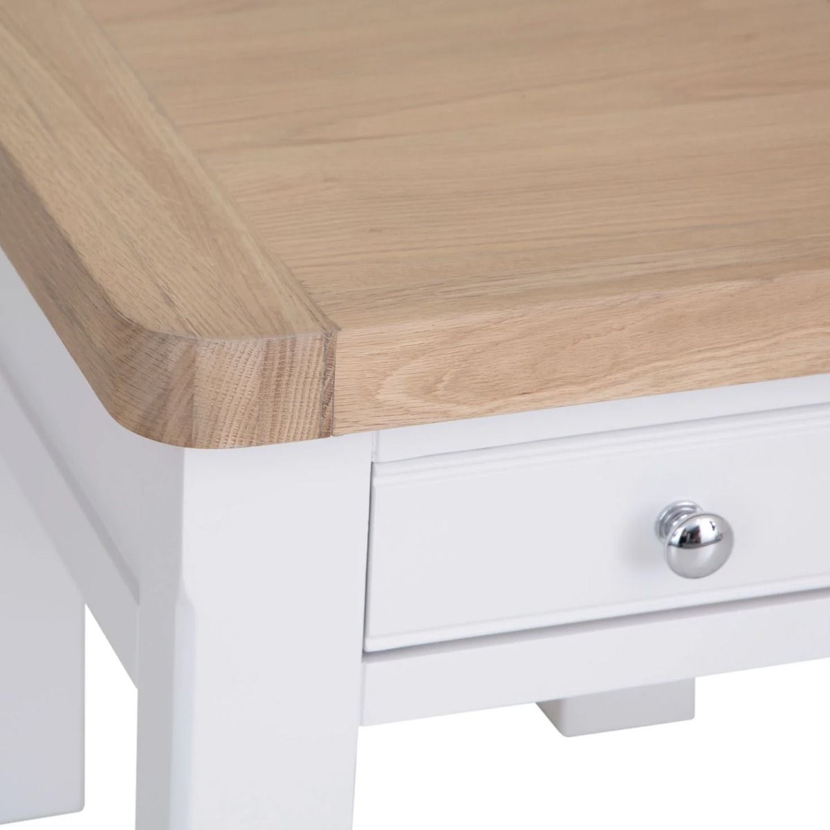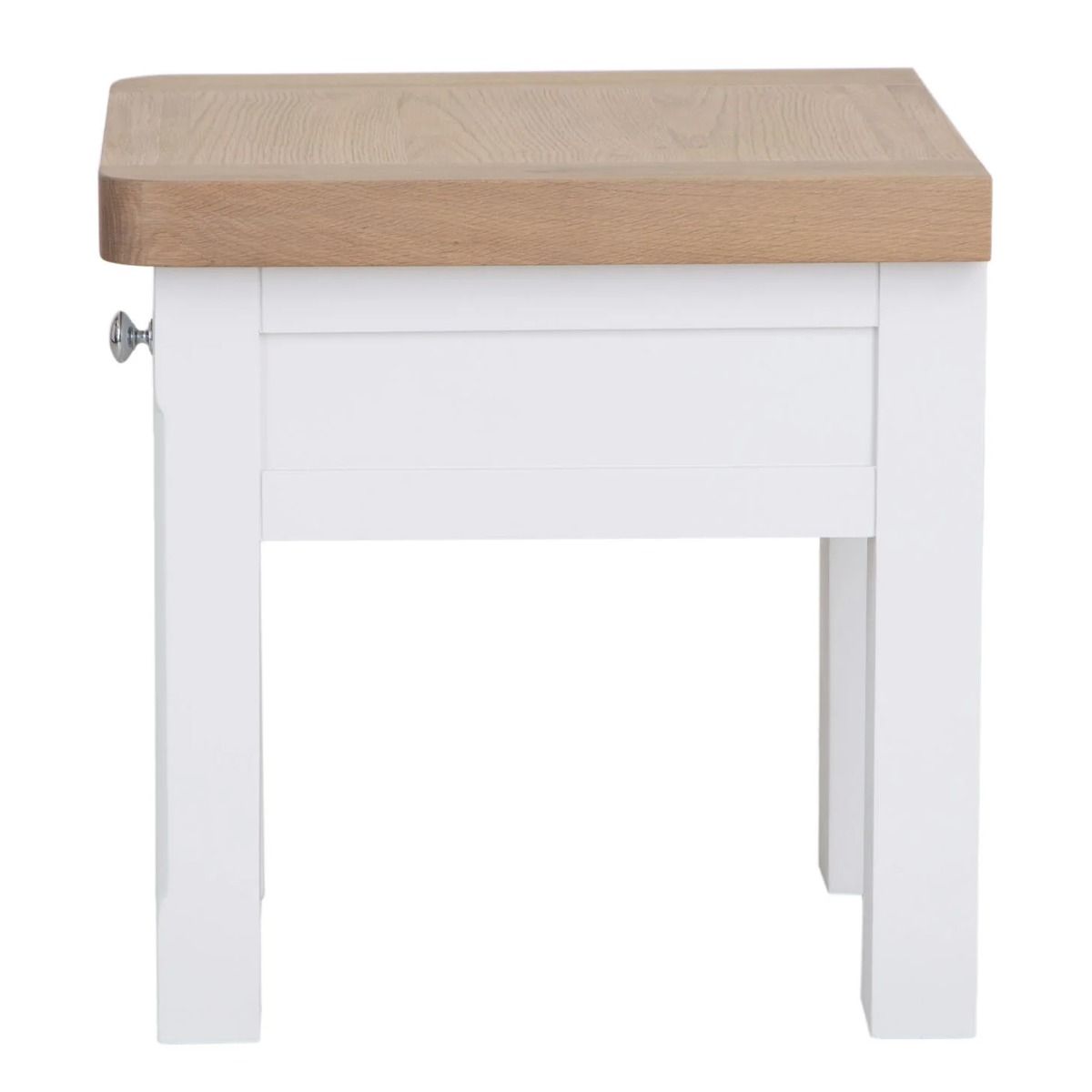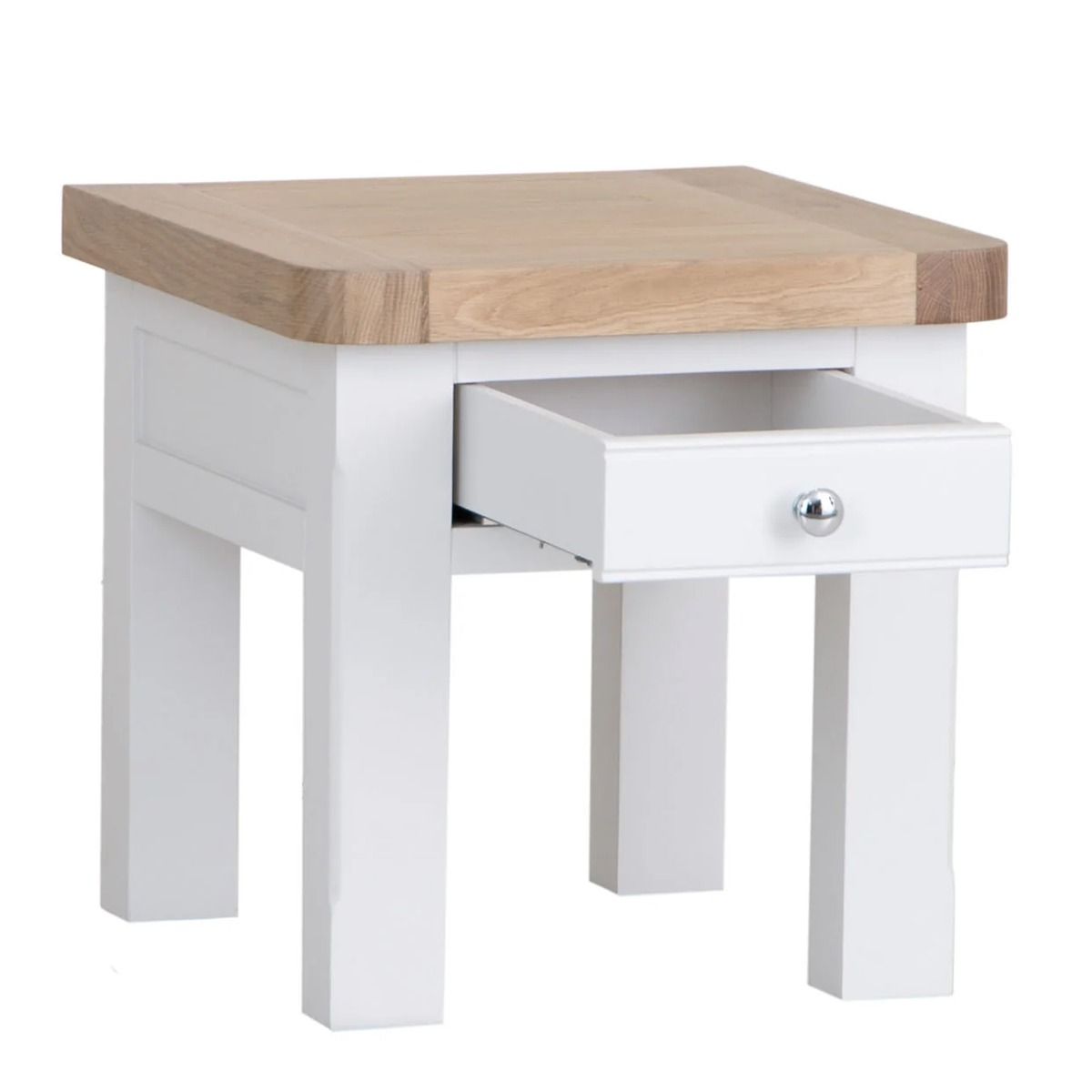Introducing our Lamp Table, a versatile and stylish addition to your living space. Featuring a single drawer with a sleek chrome handle, this table offers convenient storage for your essentials while adding a touch of modern elegance. The chunky oak top with rounded corners adds durability and charm, making it the perfect spot for your lamp or decorative items.