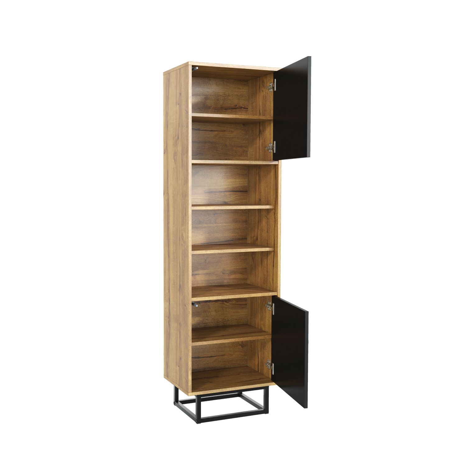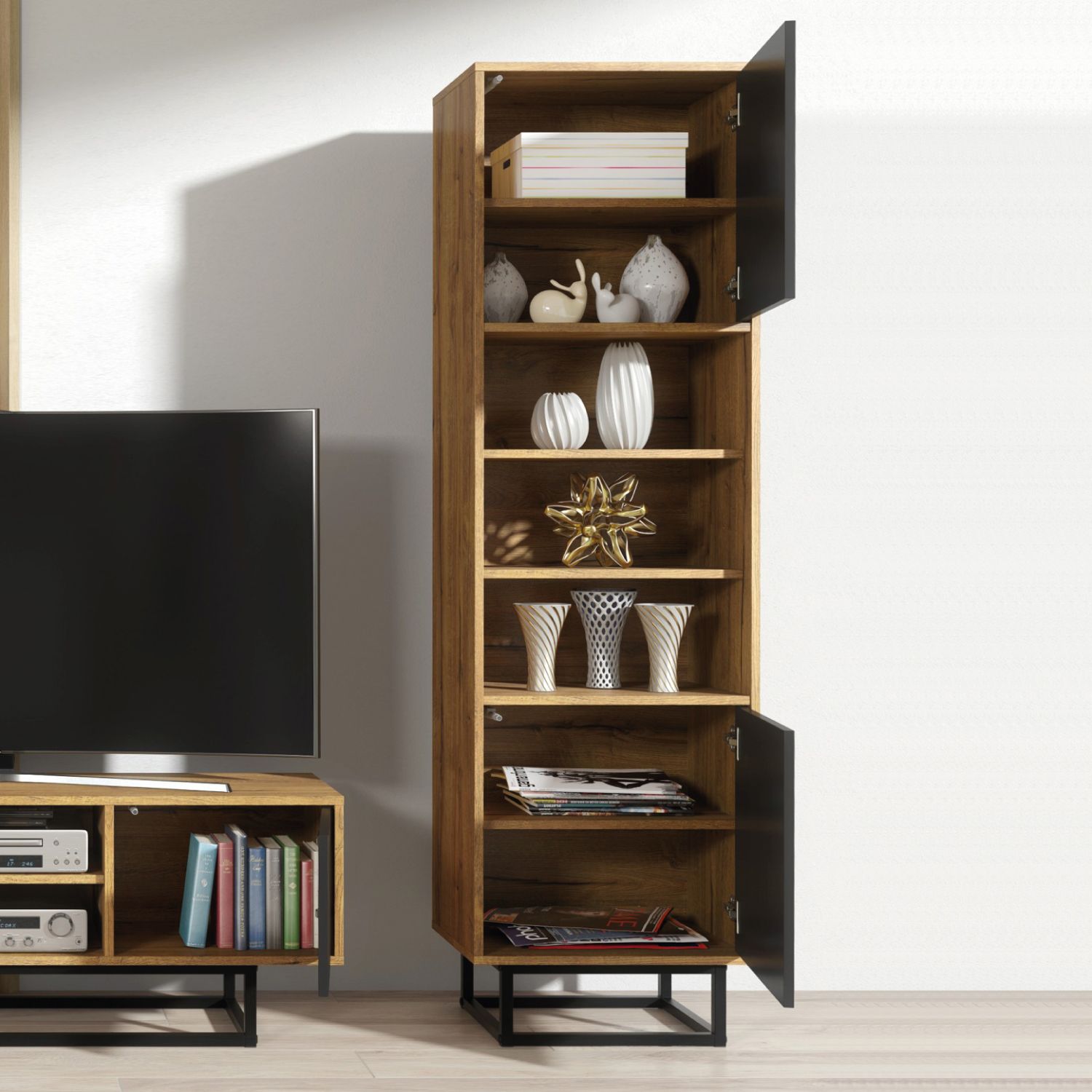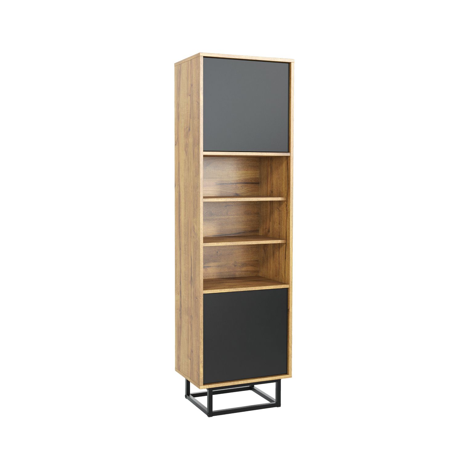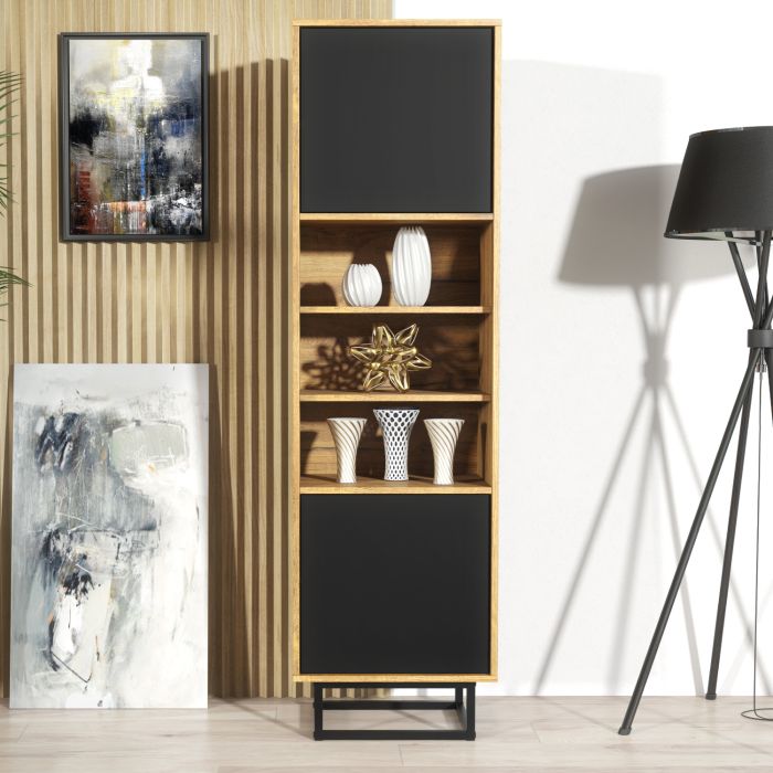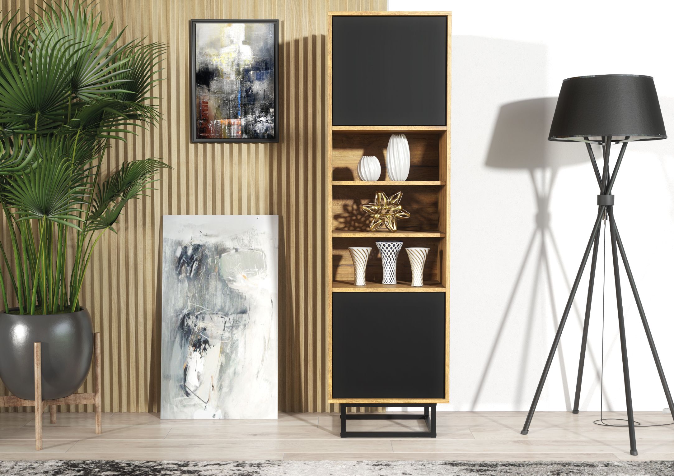 The CINQUE Loft Display Cabinet elevates your living space with its sleek design and practical functionality, making it an ideal storage solution for modern interiors. Measuring 50cm (W) x 175cm (H) x 35cm (D), this tall and elegant cabinet perfectly blends industrial-inspired aesthetics with everyday usability. Featuring two push-to-open doors, it offers spacious compartments with internal shelves, providing ample room to neatly organize essentials or conceal clutter. Between the doors are three open compartments, perfect for displaying decorative items, books, or collectibles, allowing you to add a personal touch to your space. Supported by sturdy black metal legs, the cabinet combines stability with a contemporary, industrial flair, while its clean lines and minimalist design make it a versatile addition to any room. Crafted from durable MDF and chipboard, the CINQUE Loft Display Cabinet is built to last without compromising on style. Available in Dark Oak, Dark Oak & Black Matte Doors, and Rustic & Black Matte Doors.