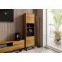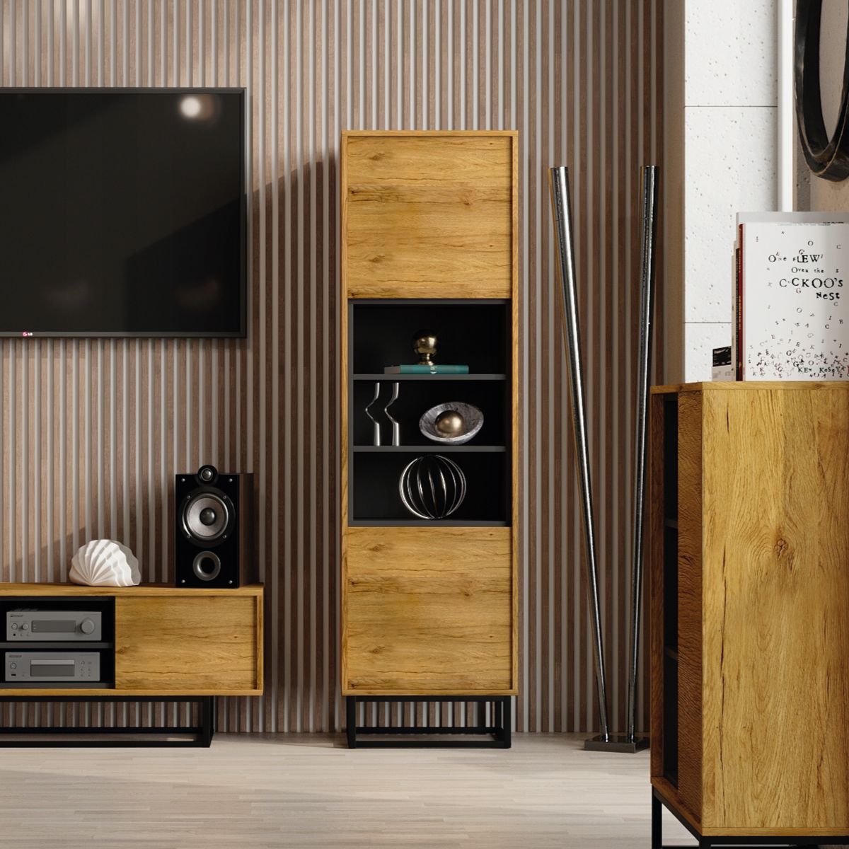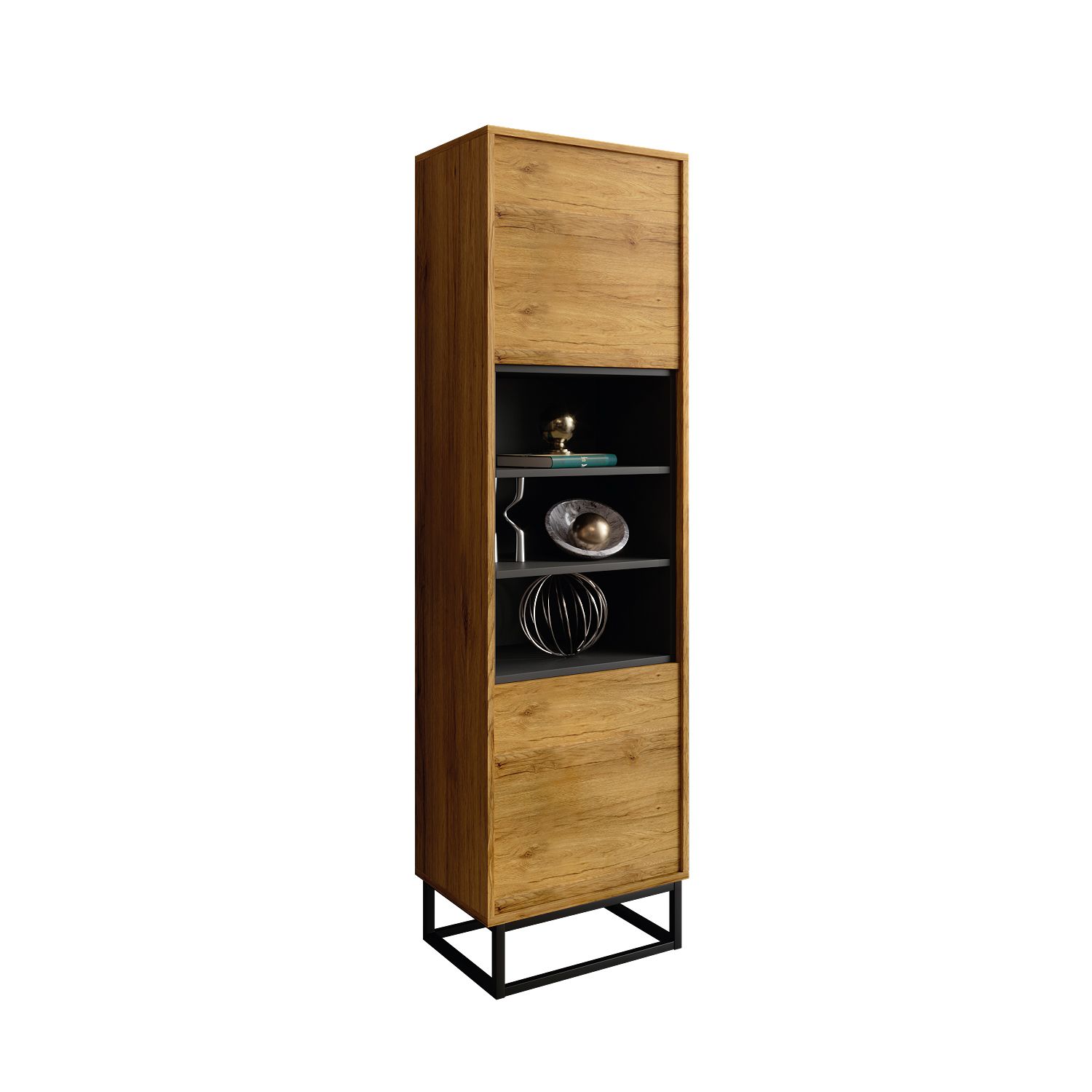 The CINQUE Loft Display Cabinet elevates your living space with its sleek design and practical functionality, making it an ideal storage solution for modern interiors. Measuring 50cm (W) x 175cm (H) x 35cm (D), this tall and elegant cabinet perfectly blends industrial-inspired aesthetics with everyday usability. Featuring two push-to-open doors, it offers spacious compartments with internal shelves, providing ample room to neatly organize essentials or conceal clutter. Between the doors are three open compartments, perfect for displaying decorative items, books, or collectibles, allowing you to add a personal touch to your space. Supported by sturdy black metal legs, the cabinet combines stability with a contemporary, industrial flair, while its clean lines and minimalist design make it a versatile addition to any room. Crafted from durable MDF and chipboard, the CINQUE Loft Display Cabinet is built to last without compromising on style. Available in Dark Oak, Dark Oak & Black Matte Doors, and Rustic & Black Matte Doors.