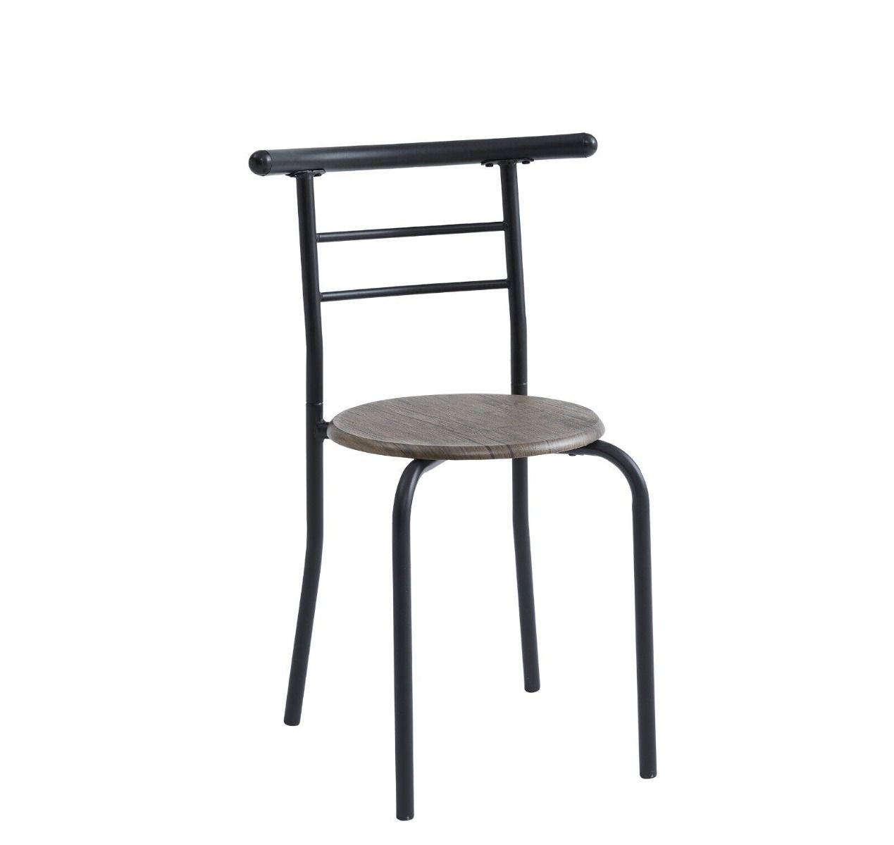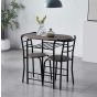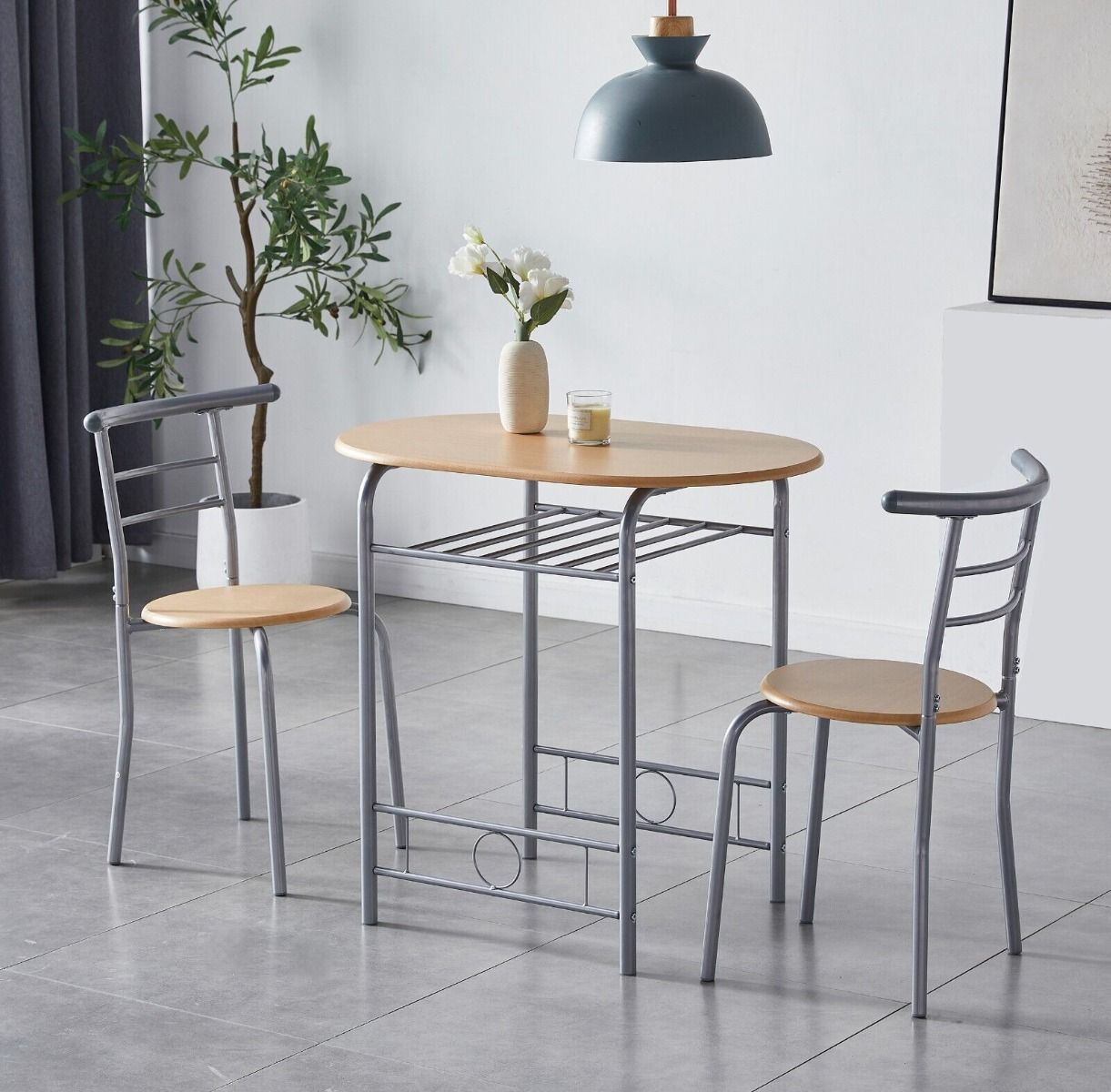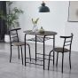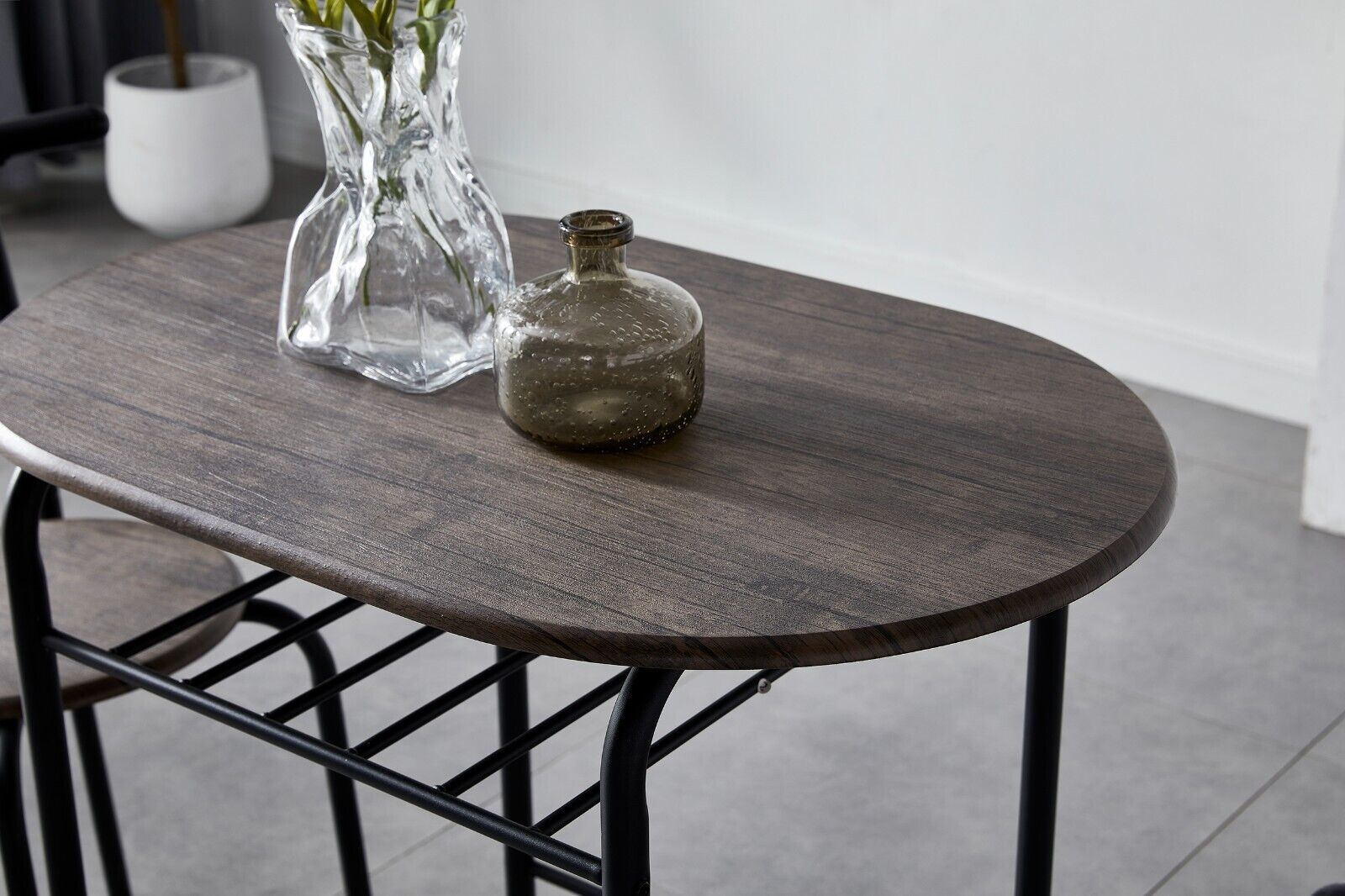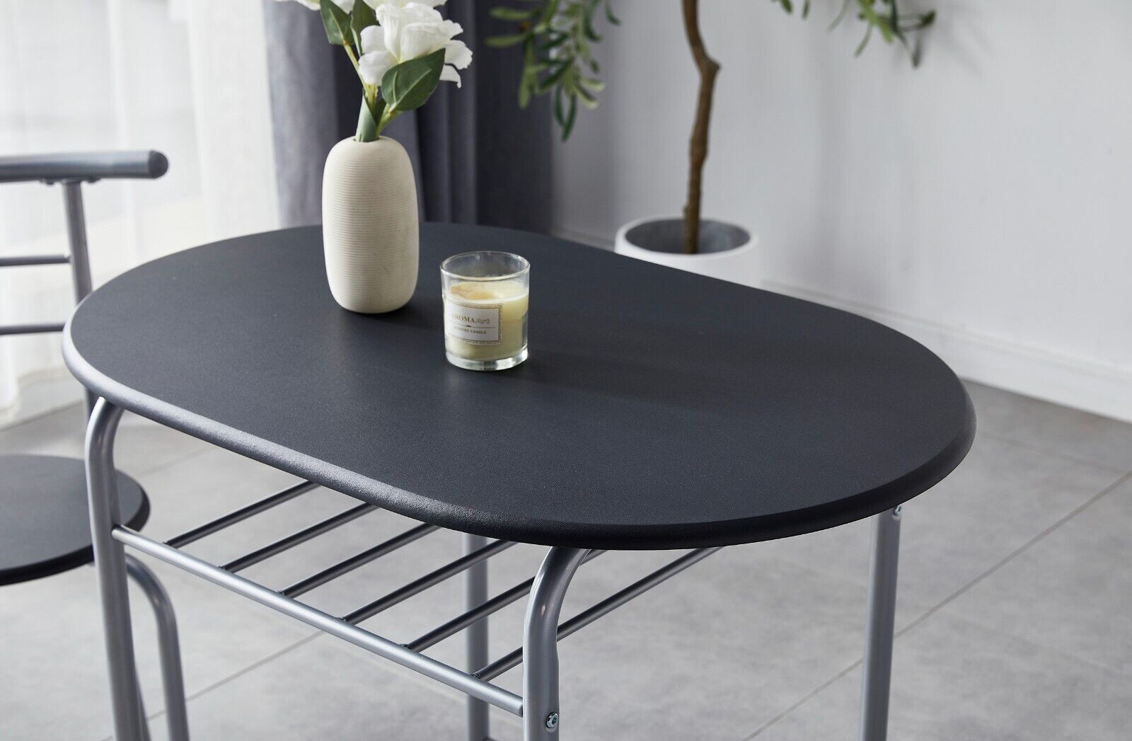 This 3 piece dining set features an elegantly curved design that will look beautiful in your kitchen/ dining room. The backs of the chairs follow the curved shape of the table so they can sit neatly under the table when not in use The black steel slat frame has a stylish restaurant style and the wood-like grains adds to the unique look and feel of this set.