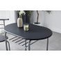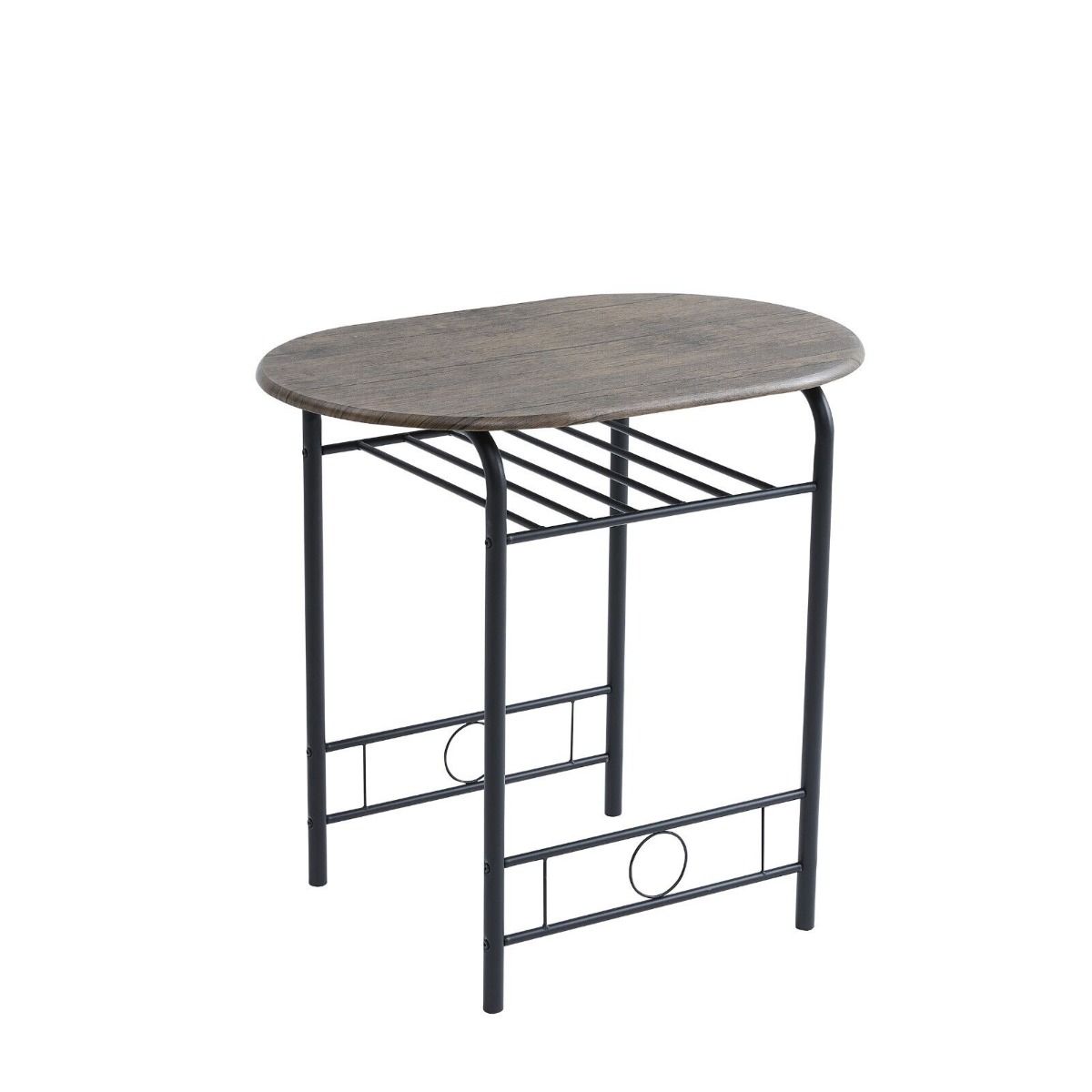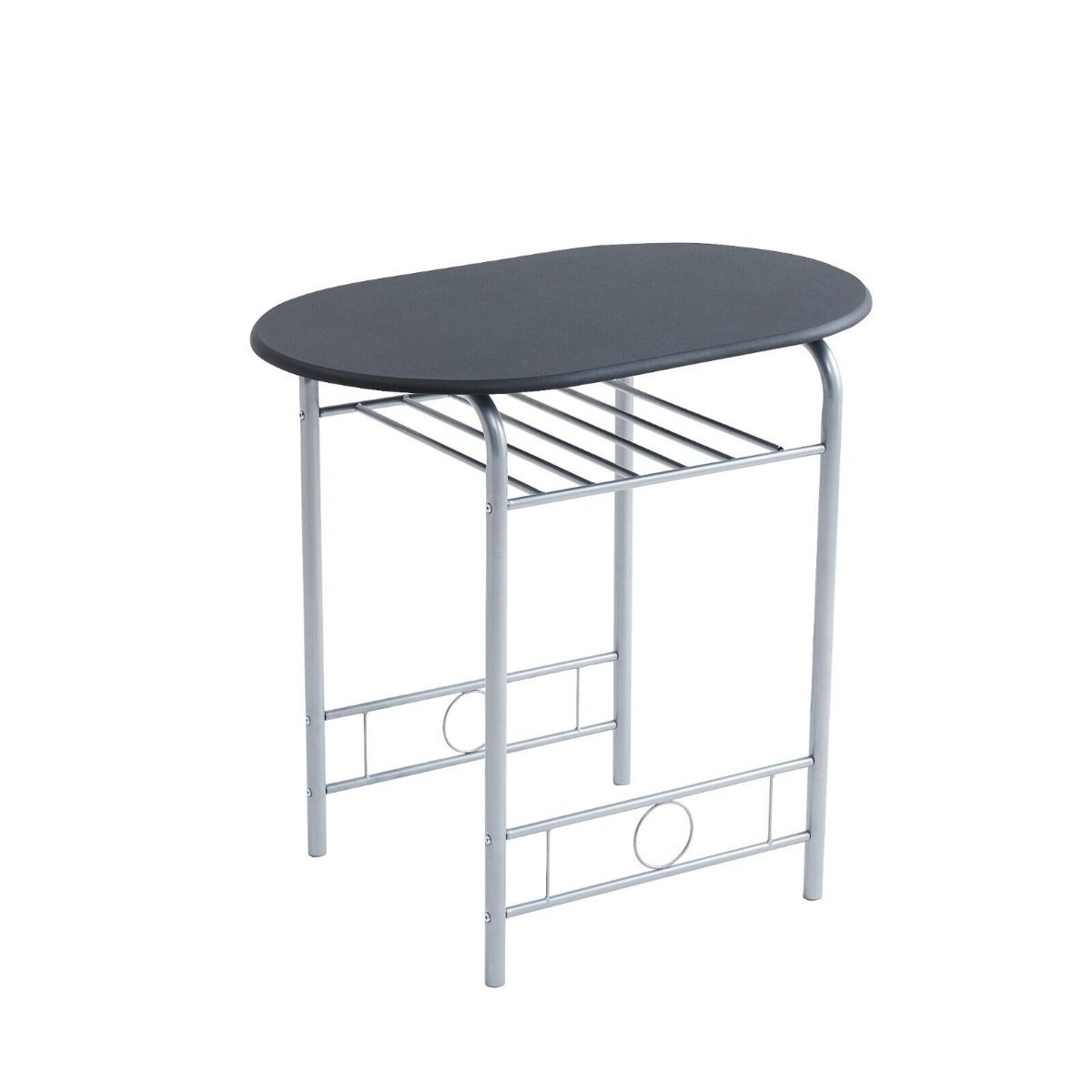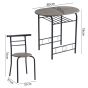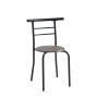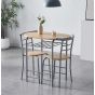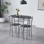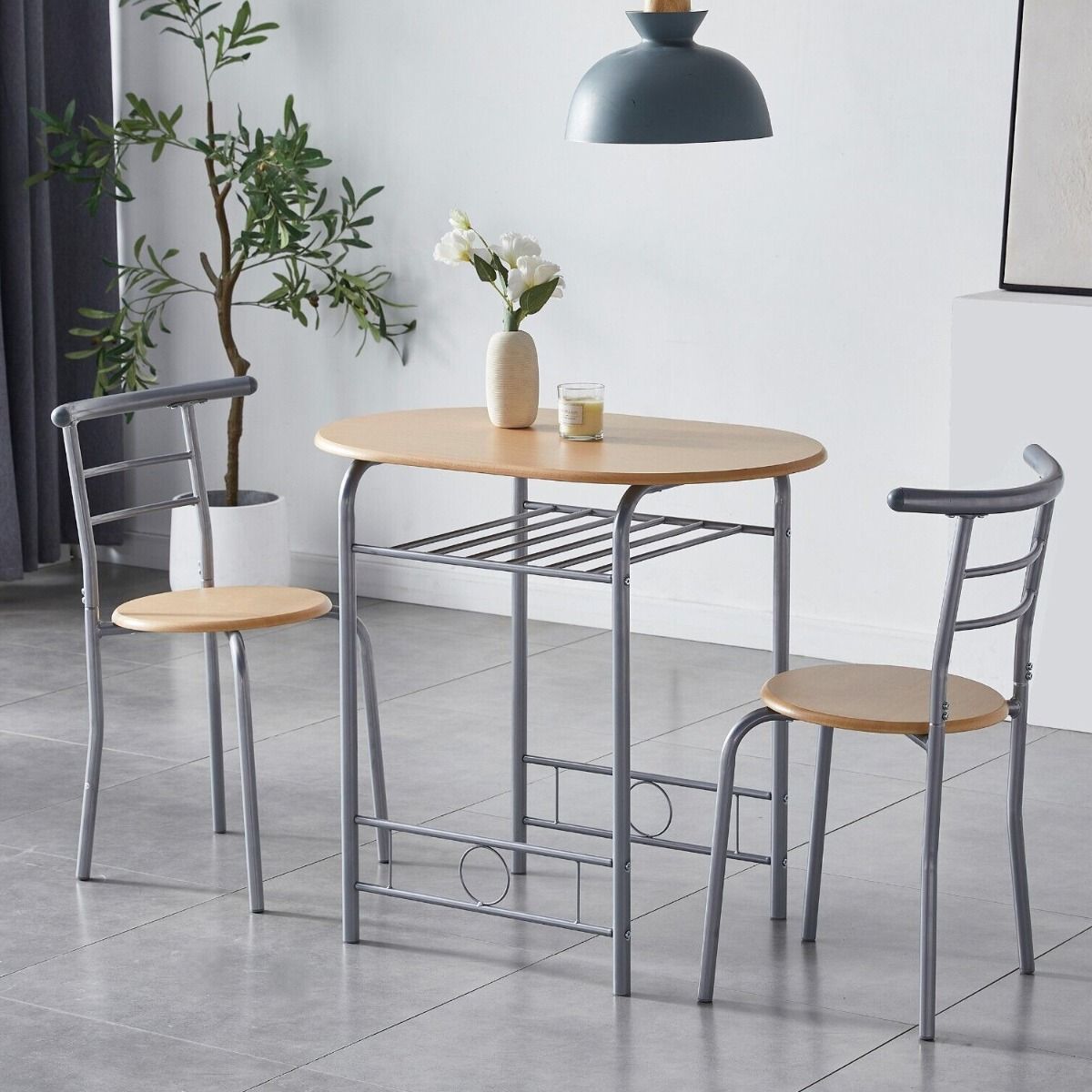 This 3 piece dining set features an elegantly curved design that will look beautiful in your kitchen/ dining room. The backs of the chairs follow the curved shape of the table so they can sit neatly under the table when not in use The black steel slat frame has a stylish restaurant style and the wood-like grains adds to the unique look and feel of this set.
