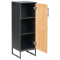 This compact cabinet is an ideal solution for smaller bathrooms where every inch of space counts. Its stylish combination of natural bamboo wood with a matte black frame creates an elegant and modern accent. The cabinet is equipped with shelves that are accessible through the opening door. It is a functional piece of furniture that helps maintain order while adding a unique character to the interior.