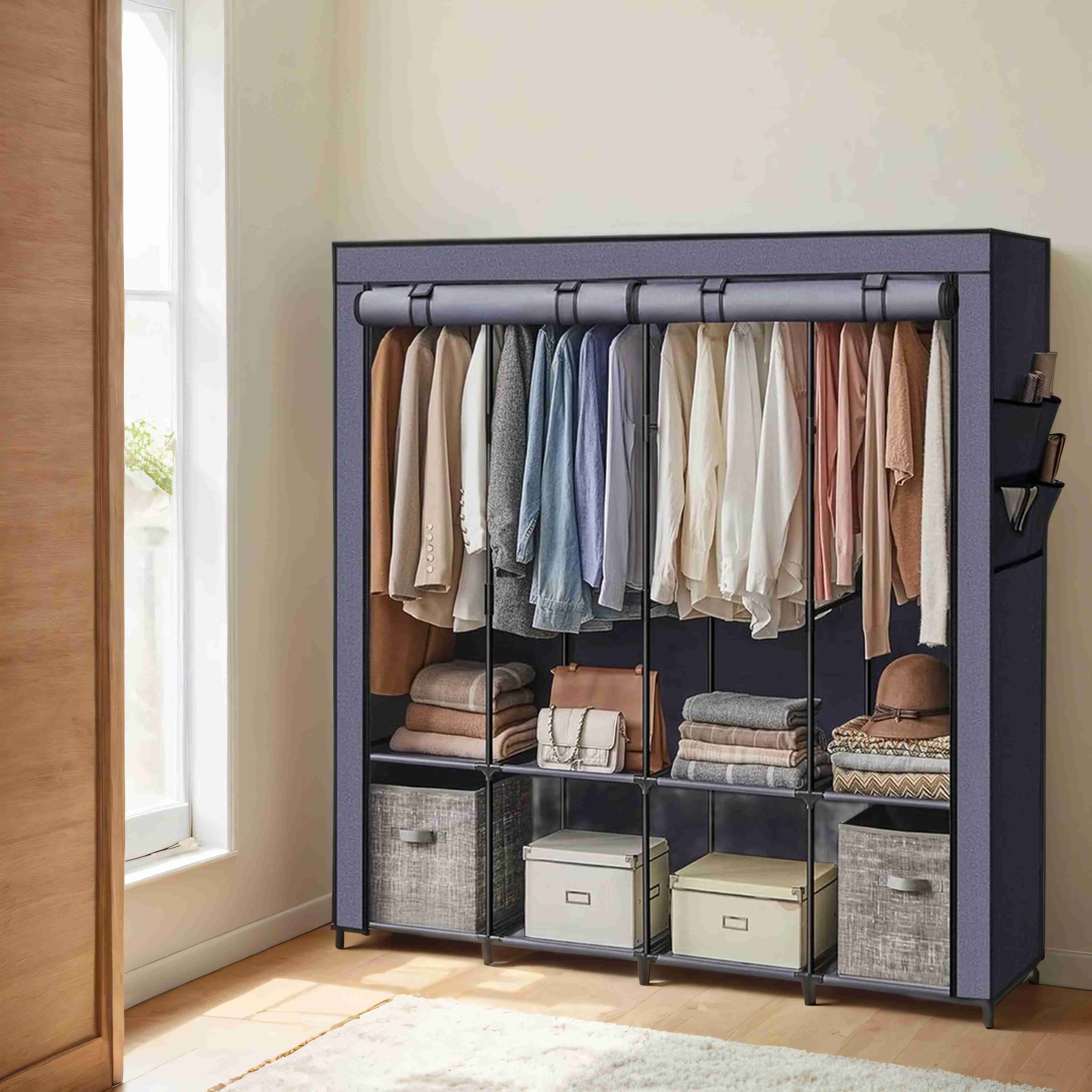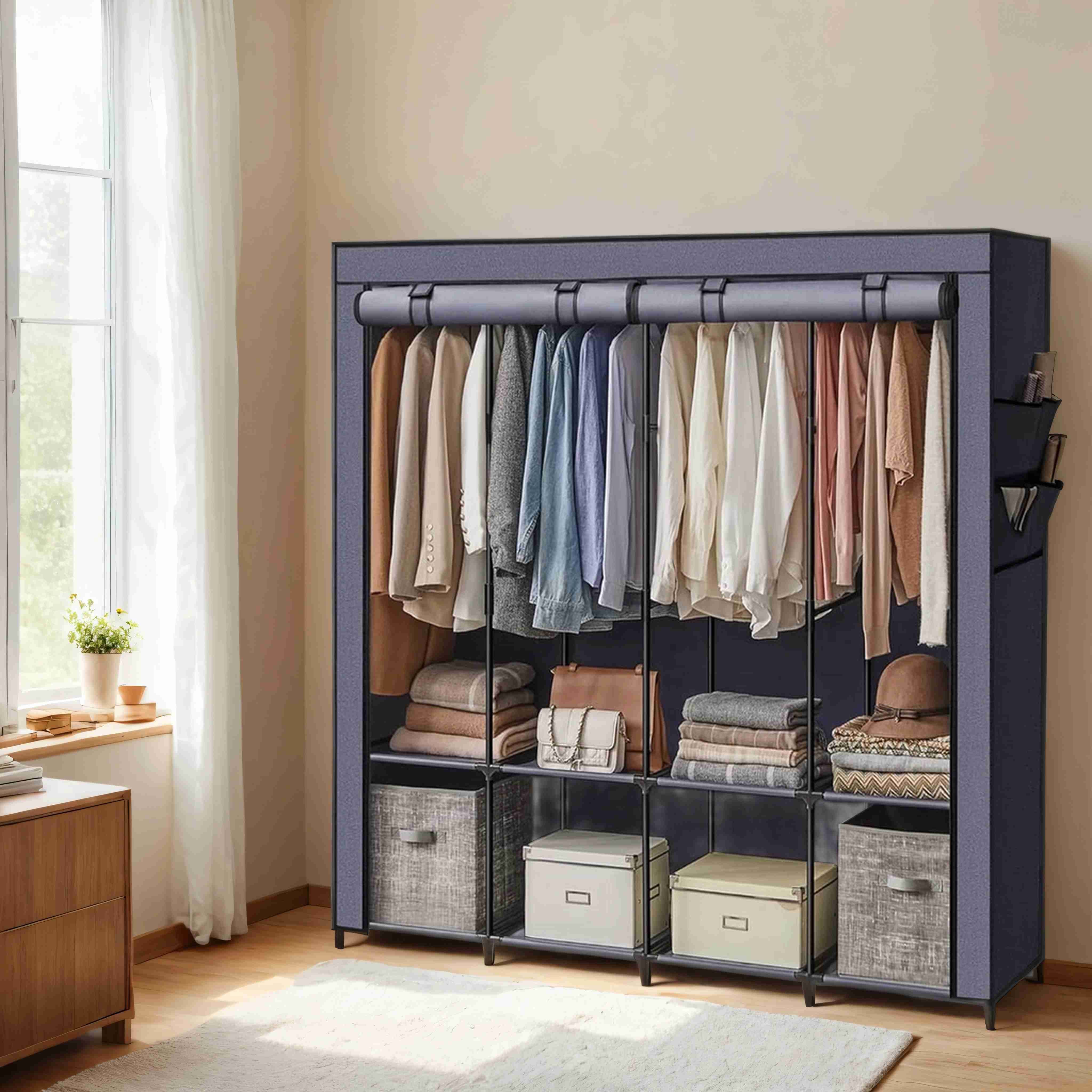Closet Organizer - ZARNIA Portable Organizer with Cover, 4 Hanging Rods and Shelves - Midnight Blue