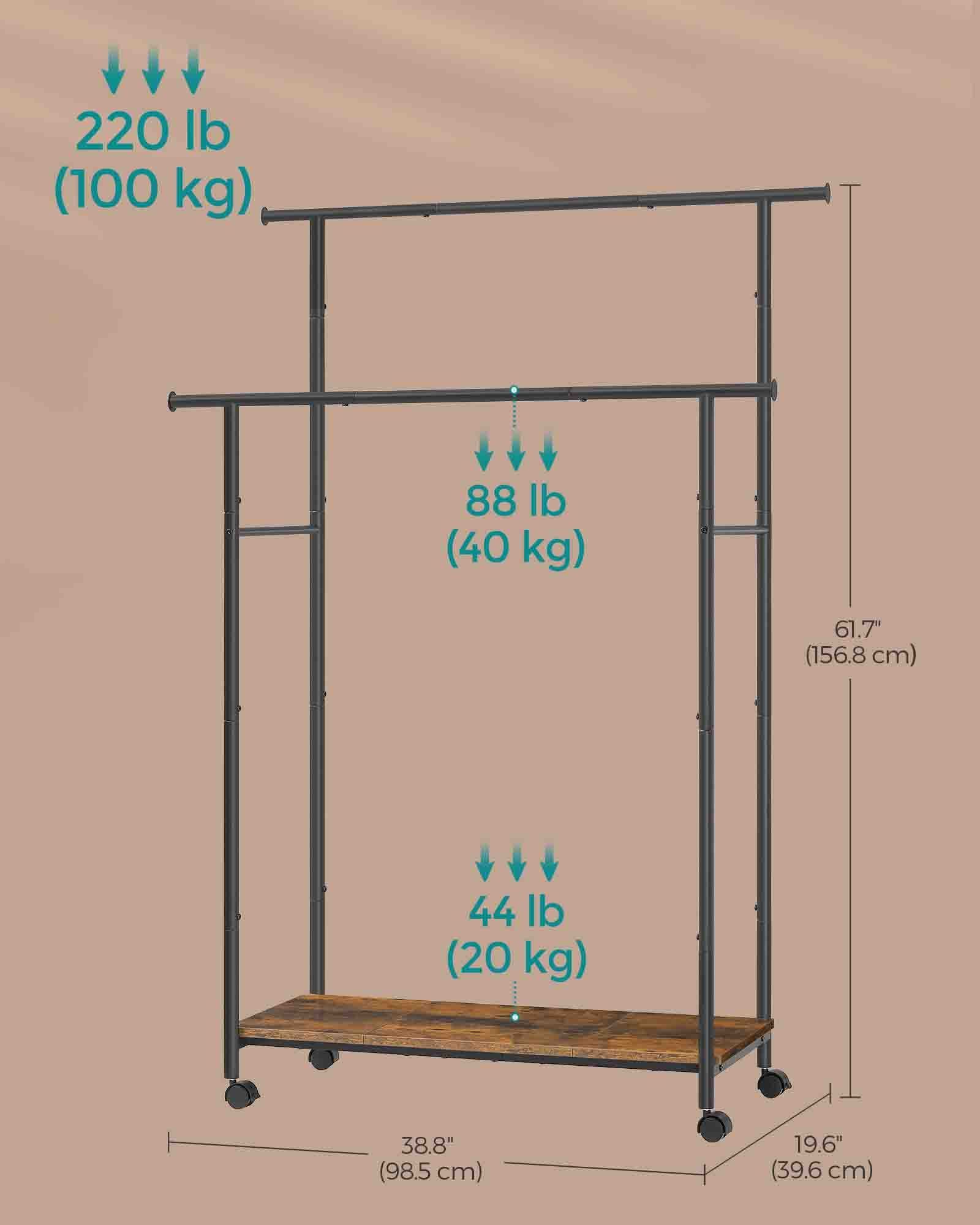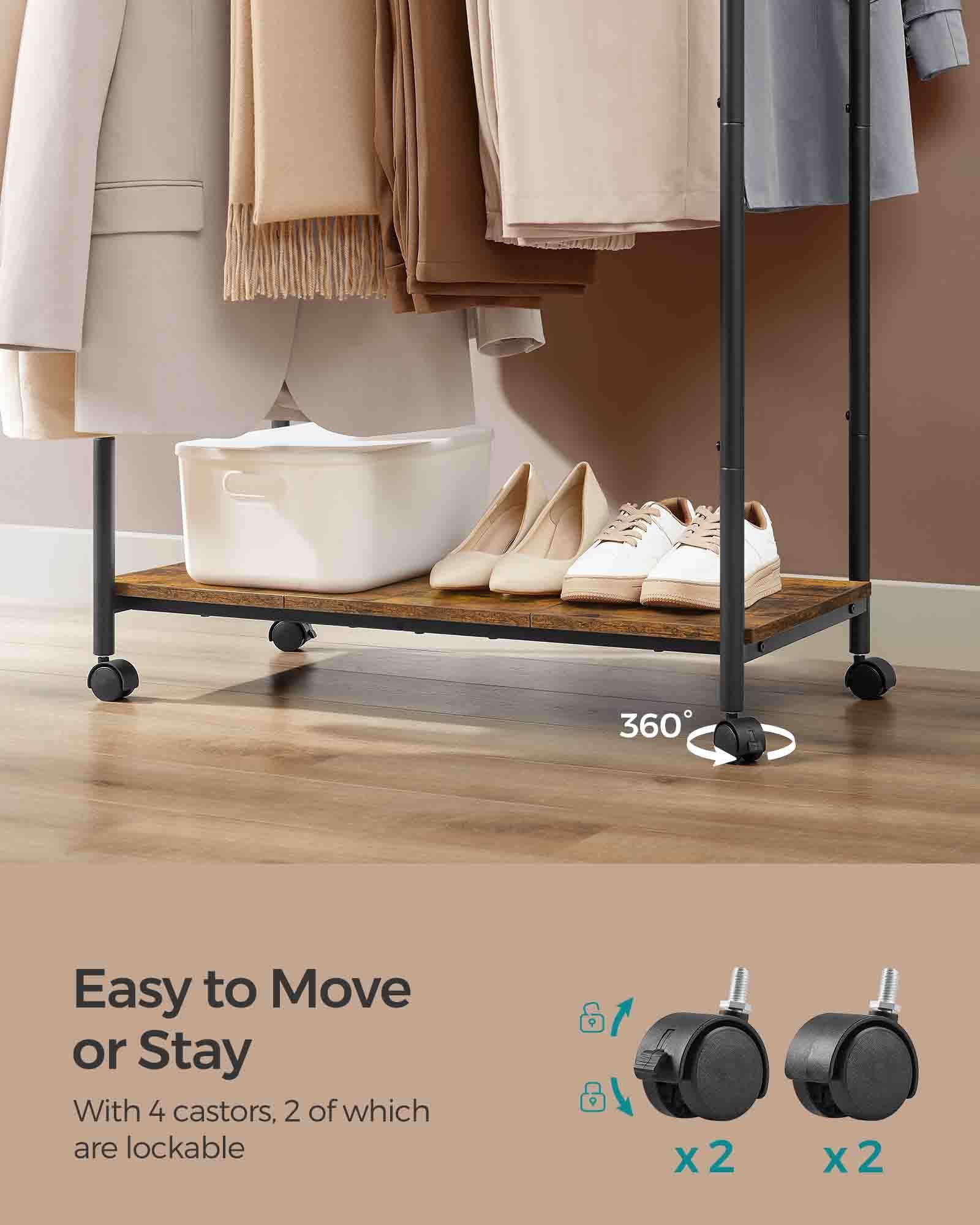 This rustic brown and ink black double-rod clothes rack offers a stylish and practical solution for your clothing storage needs. Its sturdy metal frame supports up to 100 kg, perfect for hanging a variety of garments. Featuring a convenient storage shelf below, this portable rack, measuring 98.5 cm, keeps your clothes organized and easily accessible.
