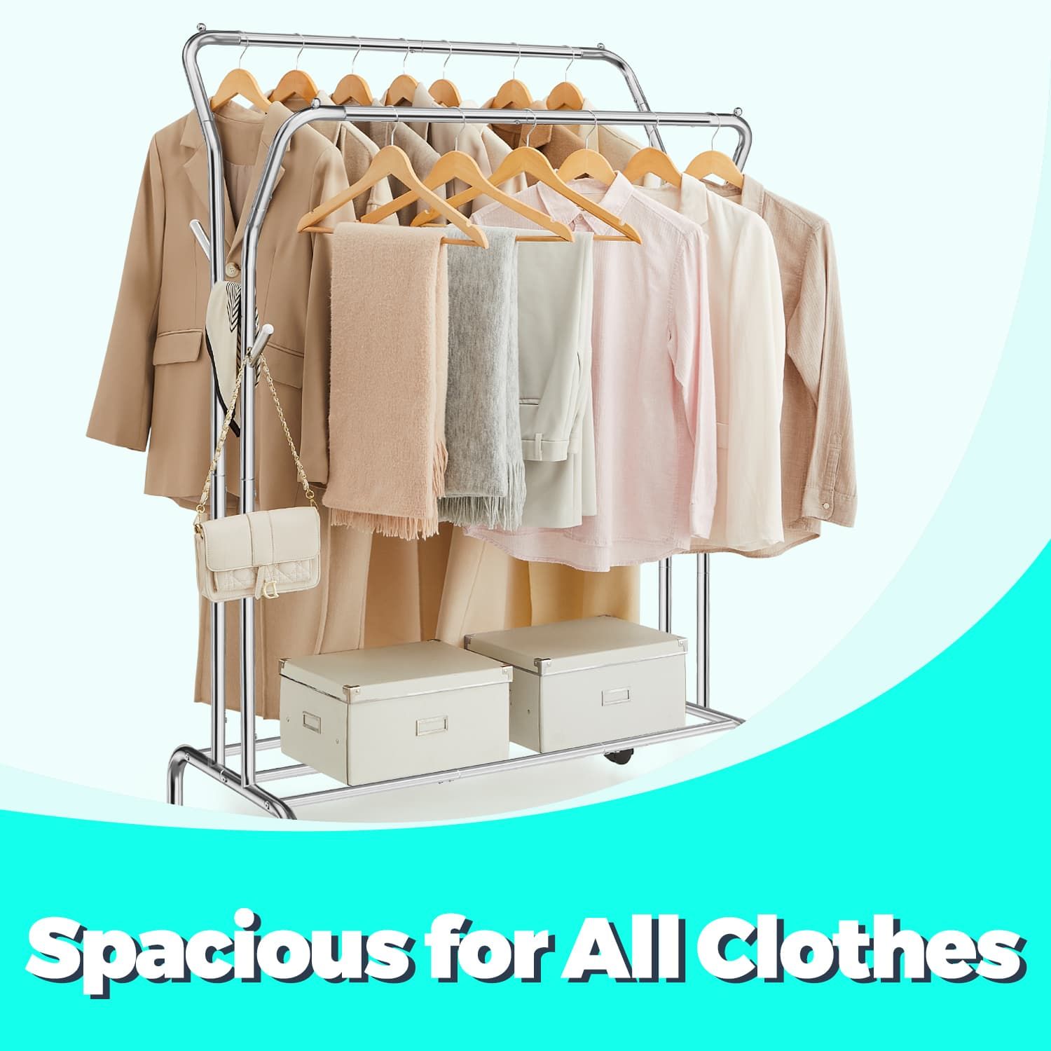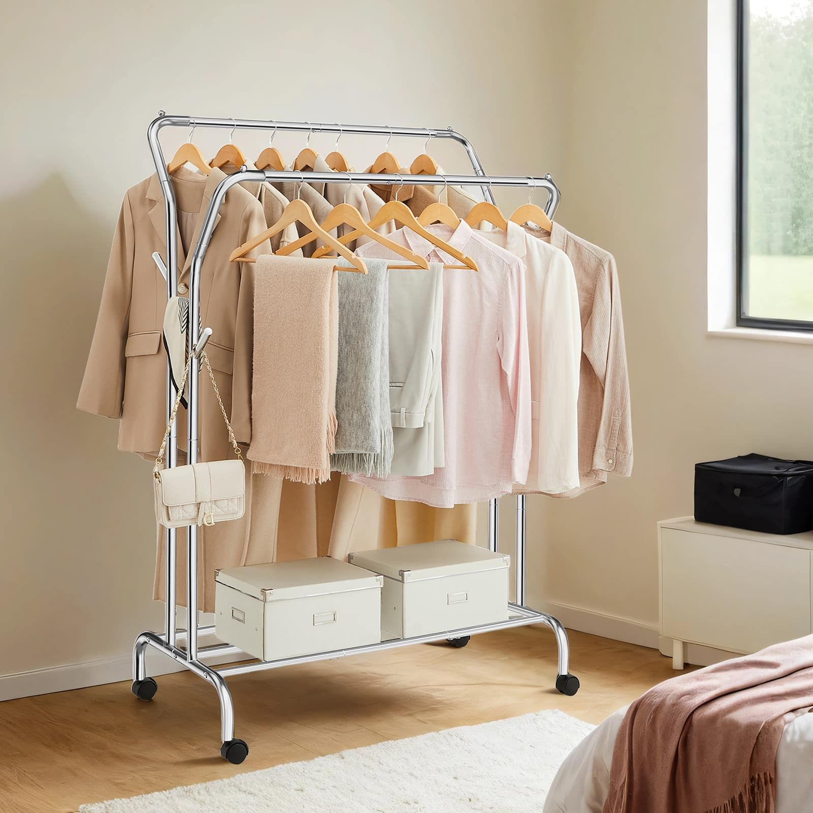 Clothes Rack - TARVA Double-Rod Heavy Duty with Wheels - Silver