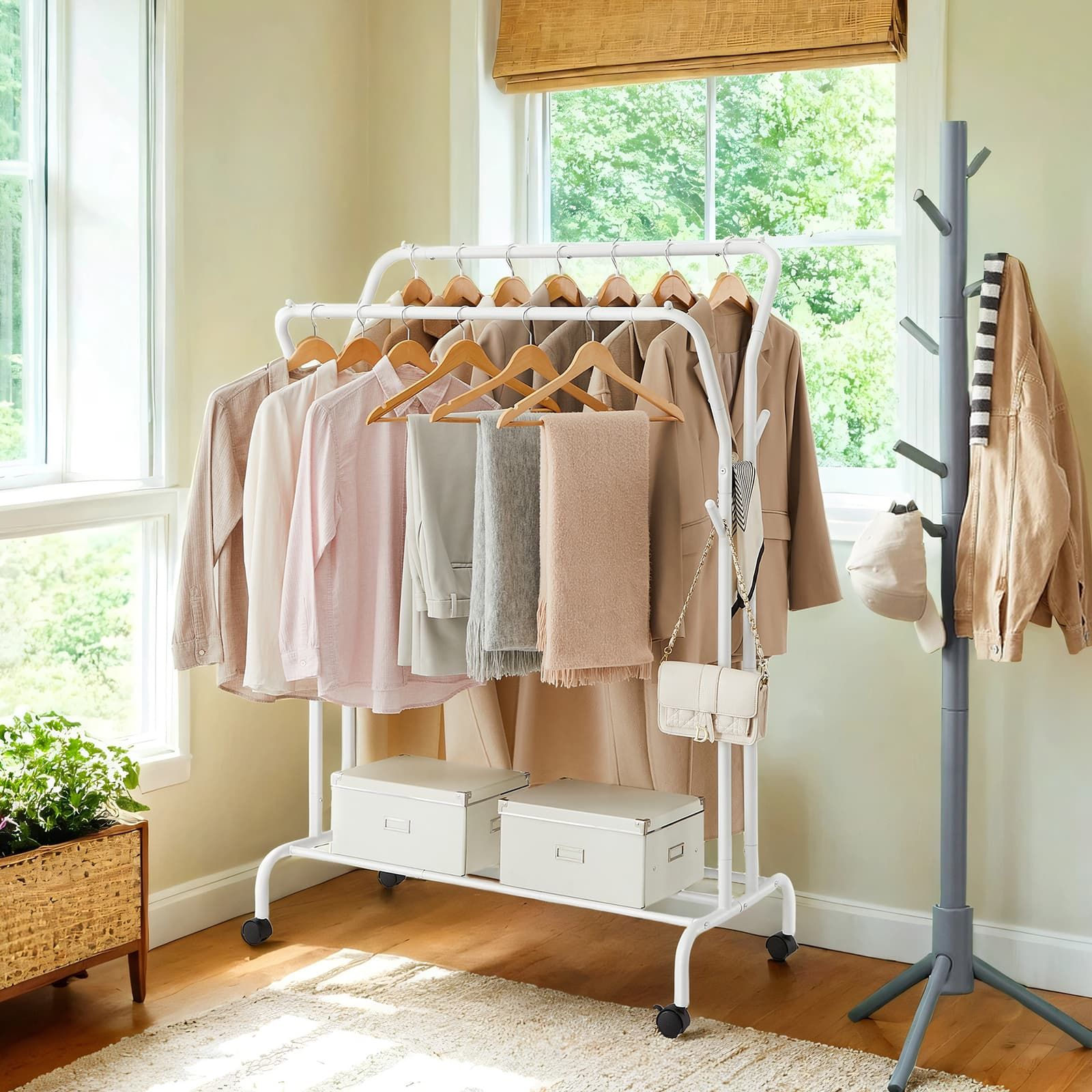 Clothes Rack - TARVA Double-Rod Heavy Duty with Wheels - White