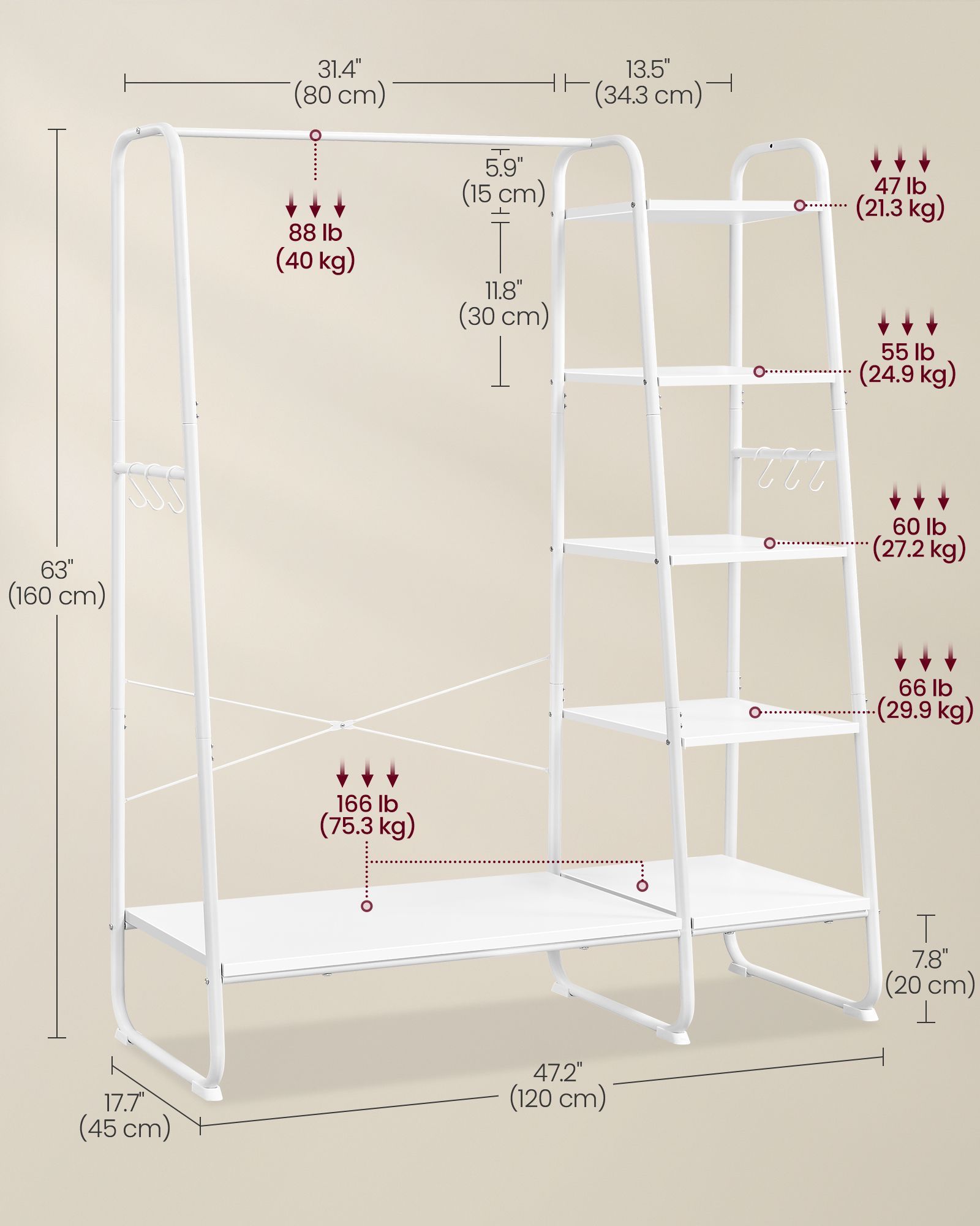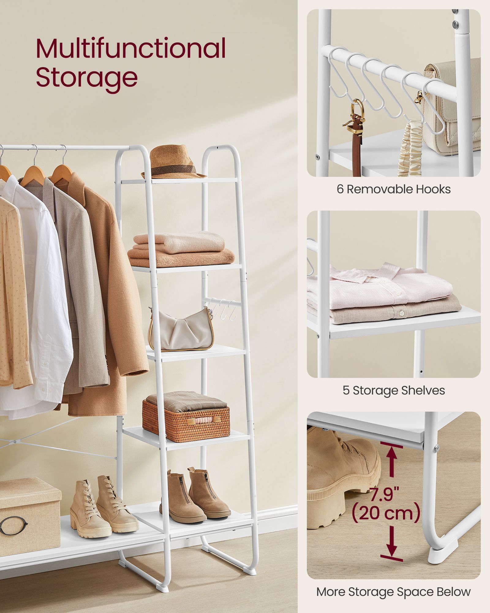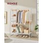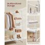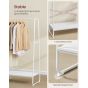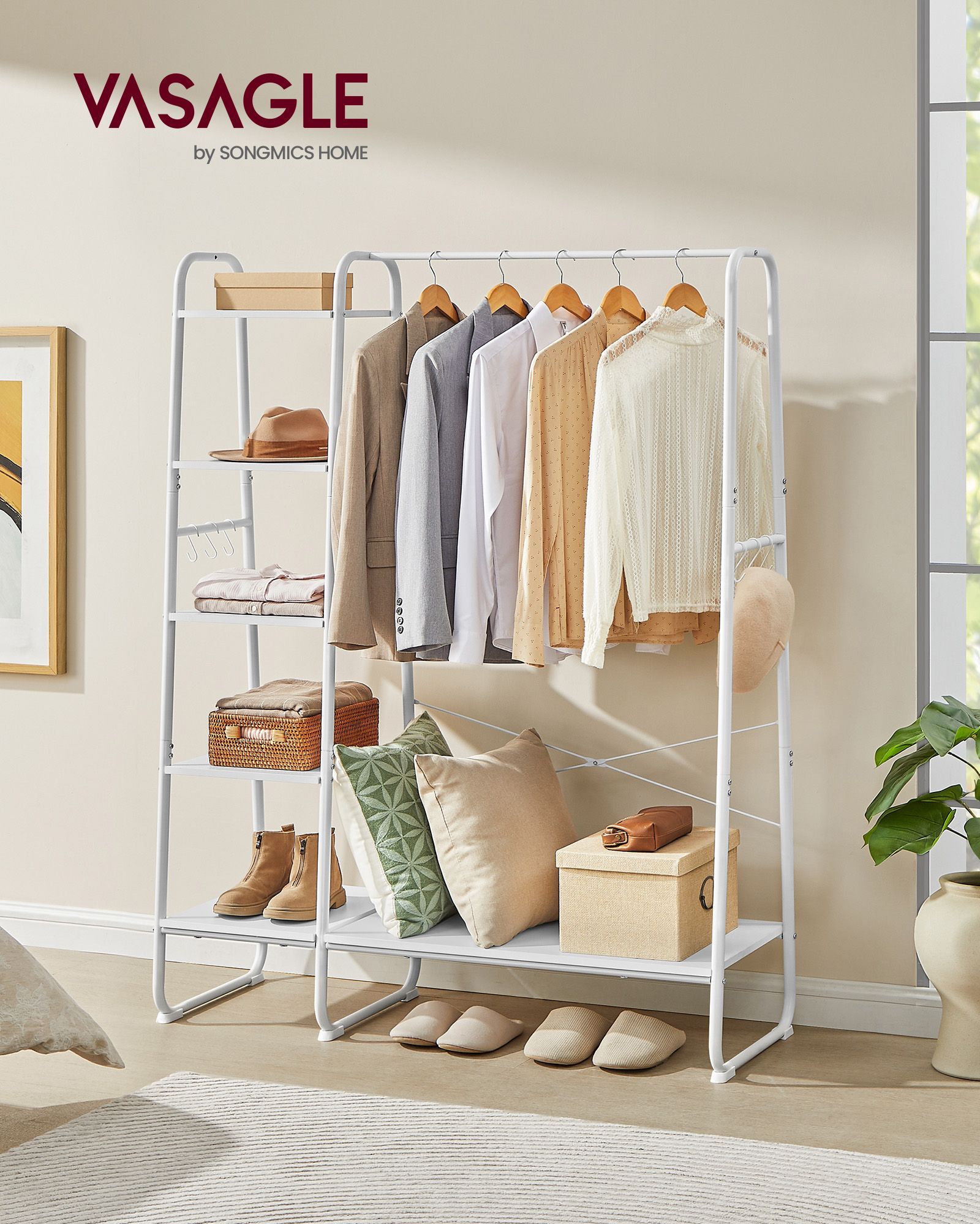 Declutter your space with the VASAGLE Clothes Rack in Cloud White and Matte White. This stylish rack features a 5-tier storage shelf for shoes and accessories, plus 6 convenient side hooks for bags and coats. Perfect for bedrooms or living rooms, it combines functionality with a clean, modern aesthetic to keep your essentials organized and accessible.