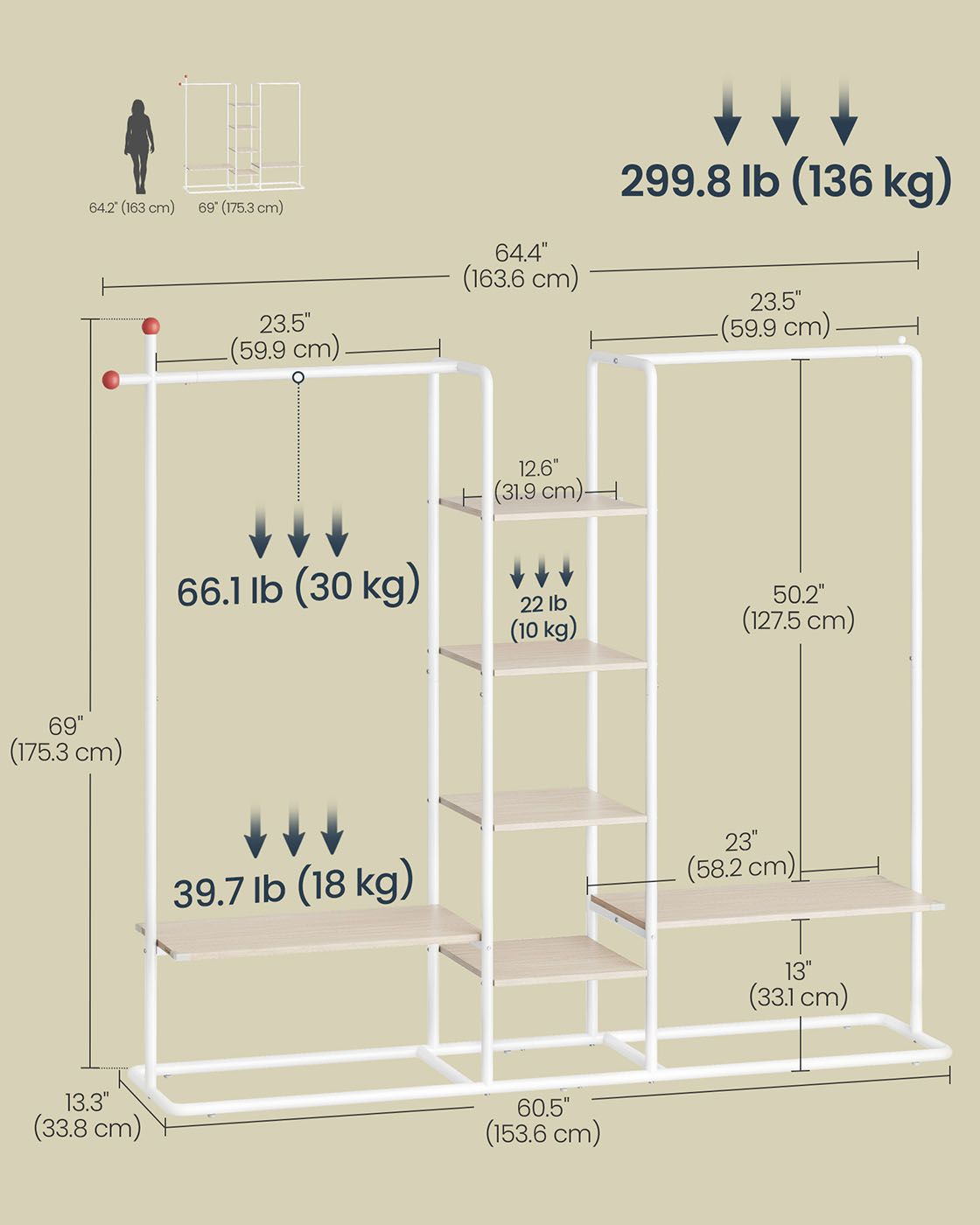 Clothes Rail - ASTLIA 6 Storage Shelves and 2 Hanging Rails - White Beige