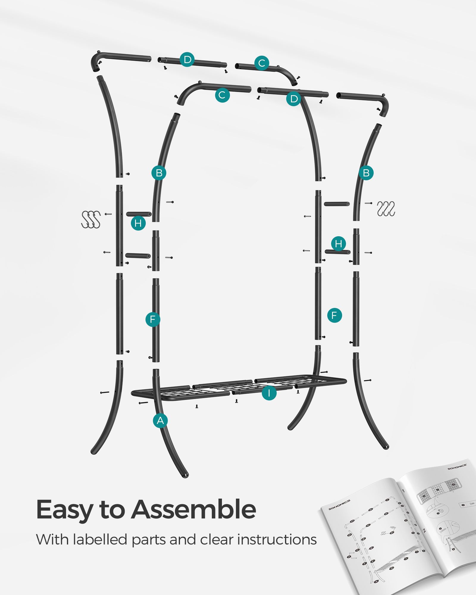 This double-rod clothes rail in Ink Black offers robust clothing storage. Its heavy-duty metal frame supports ample hanging space, perfect for organizing garments in bedrooms or living rooms. Featuring 6 convenient hooks and a practical storage shelf, it's a portable and heavy-duty solution for your clothing storage needs.