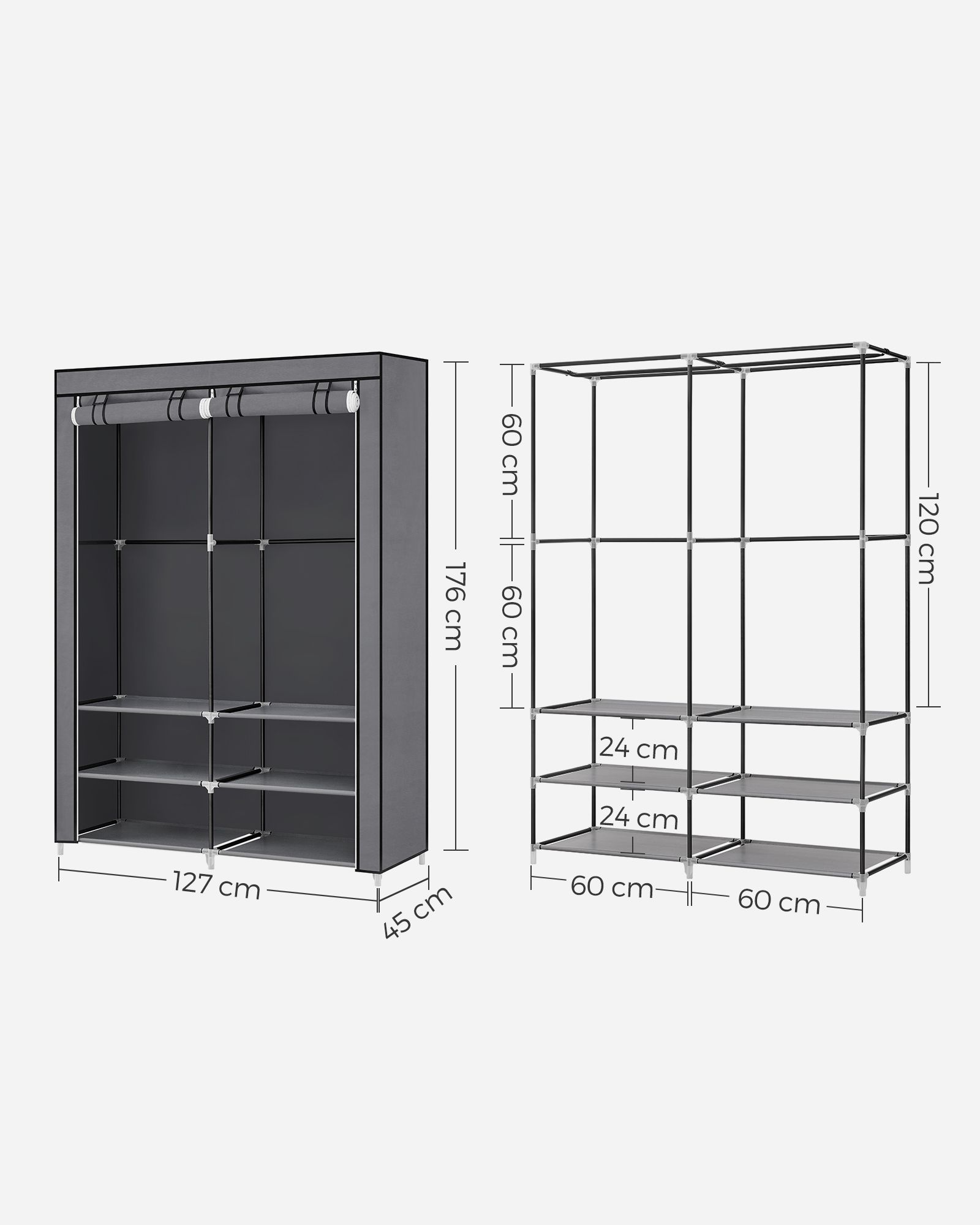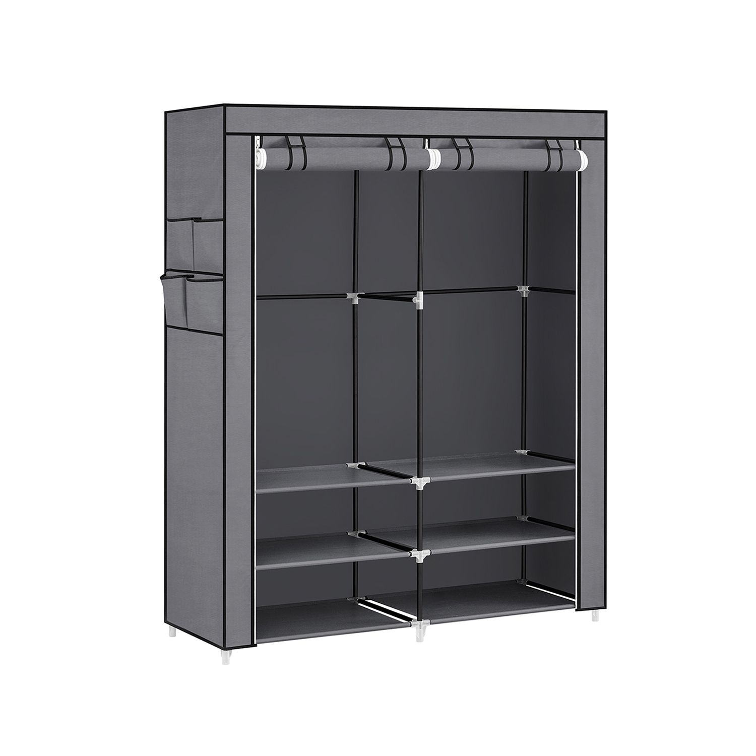 Clothes Wardrobe, Portable Closet, 45 x 127 x 176 cm, 2 Hanging Rails, Shelves, and 4 Side Pockets, Large Capacity for Bedroom, Living Room, Grey RYG008G02