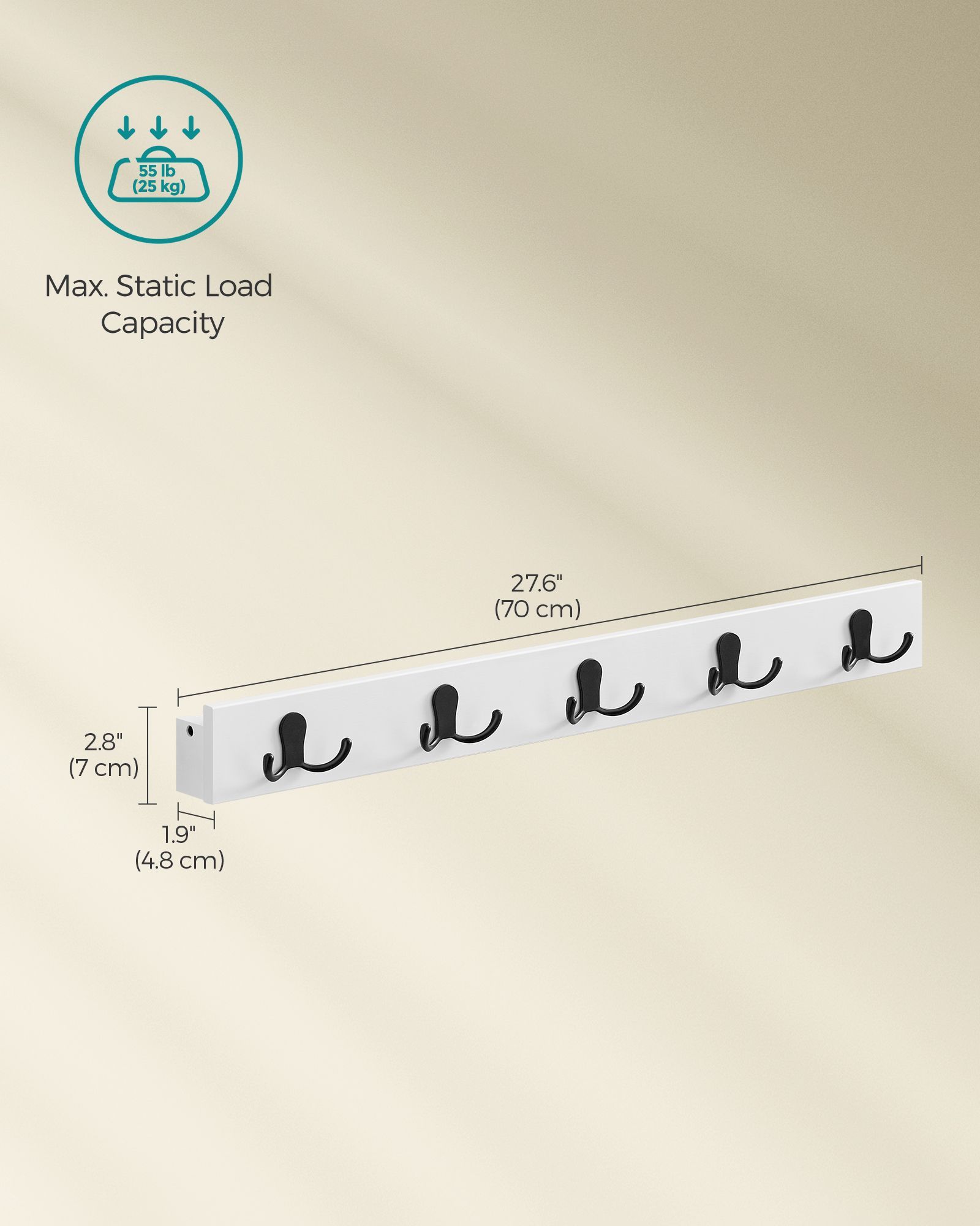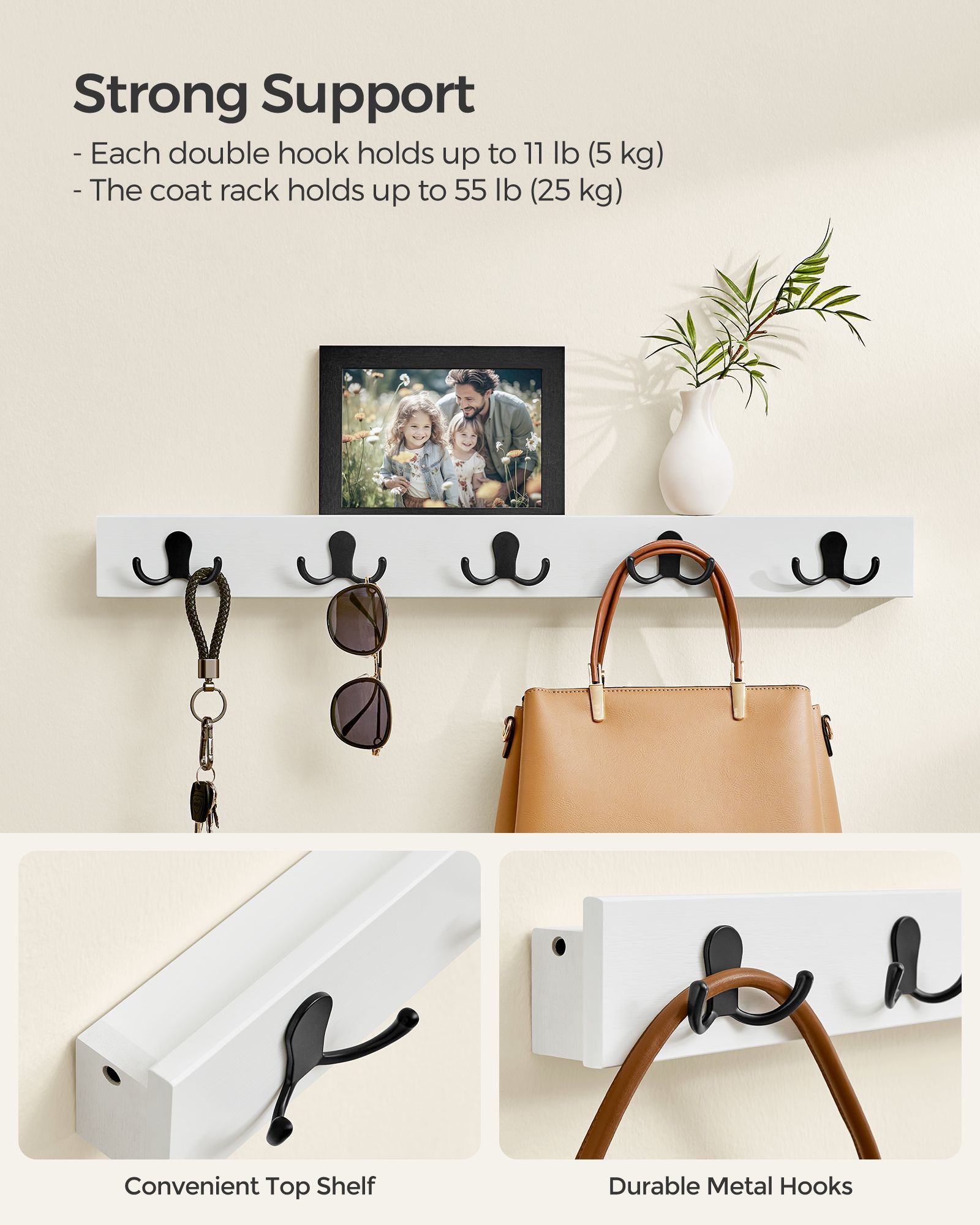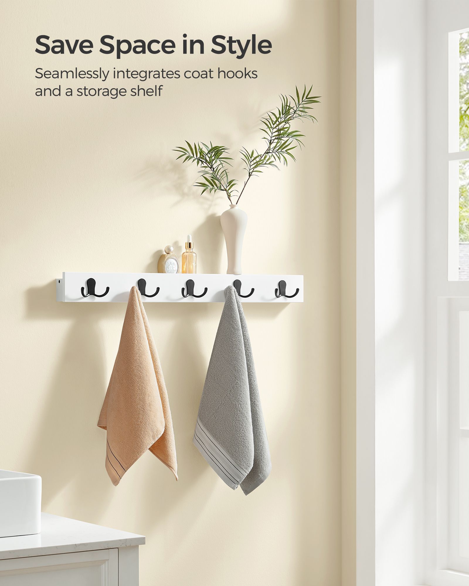 Declutter your space with this stylish Cloud White wall-mounted coat rack. Featuring a convenient shelf for extra storage and five sturdy double metal hooks, it's perfect for organizing coats, bags, and more in your hallway, living room, or bedroom. This space-saving solution supports up to 55 lbs per hook, offering durable and practical organization.