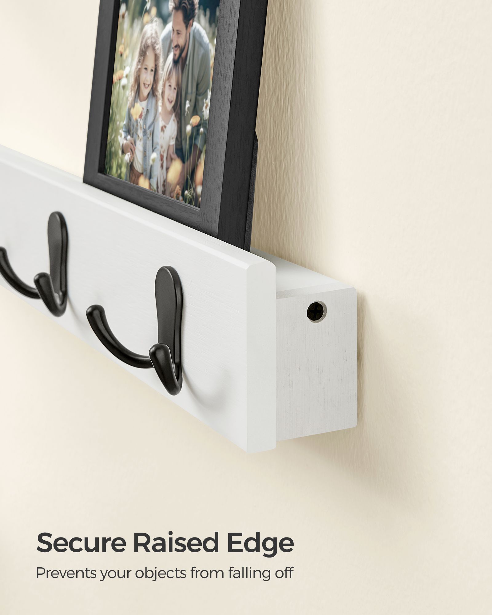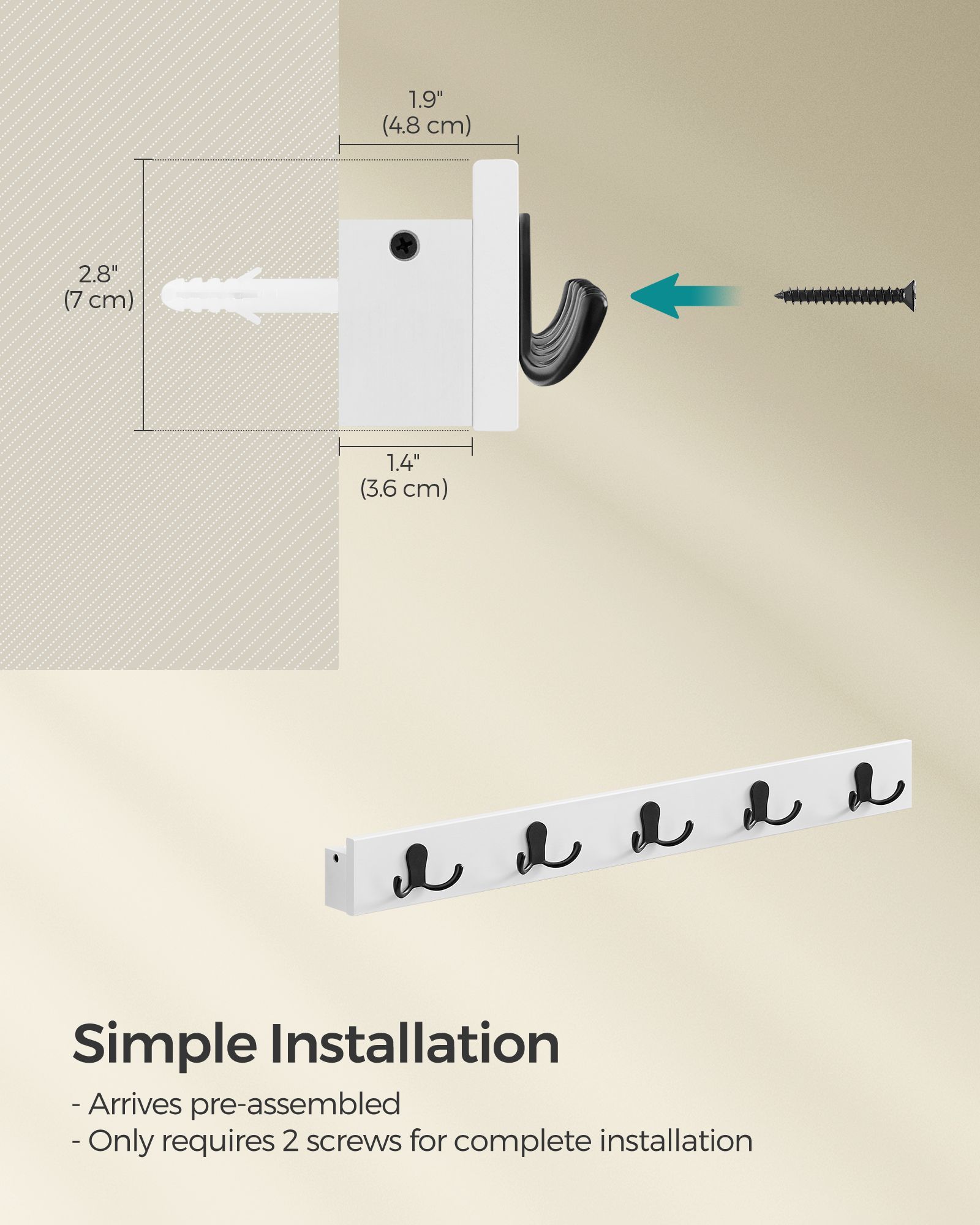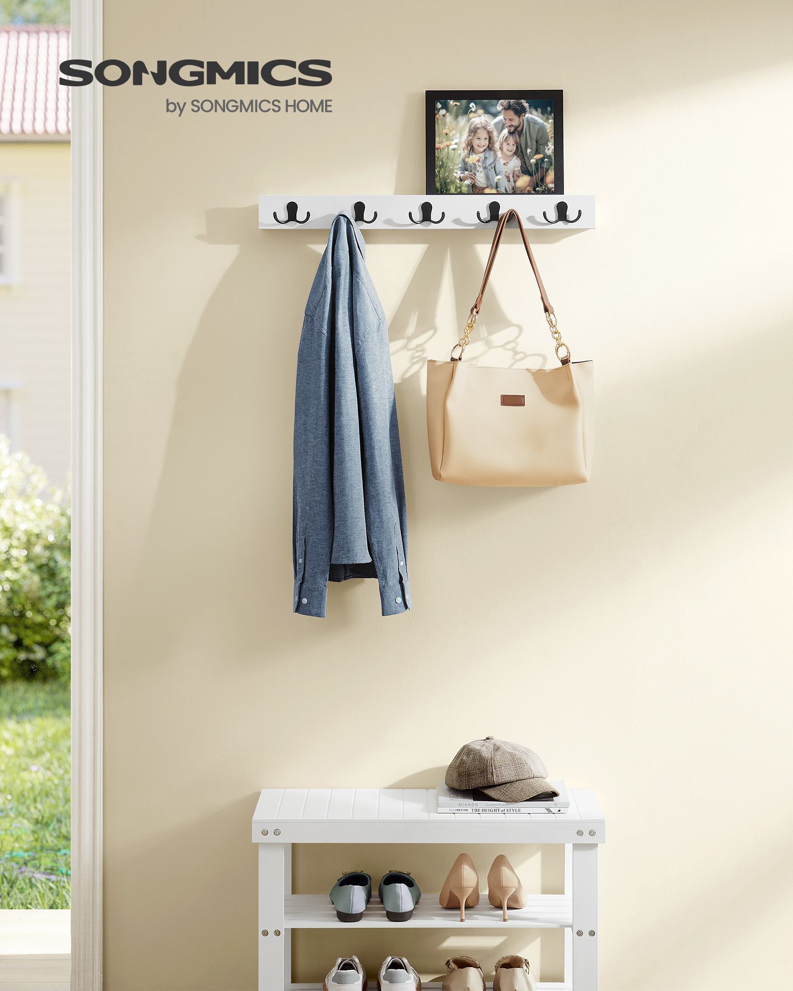 Declutter your space with this stylish Cloud White wall-mounted coat rack. Featuring a convenient shelf for extra storage and five sturdy double metal hooks, it's perfect for organizing coats, bags, and more in your hallway, living room, or bedroom. This space-saving solution supports up to 55 lbs per hook, offering durable and practical organization.