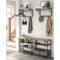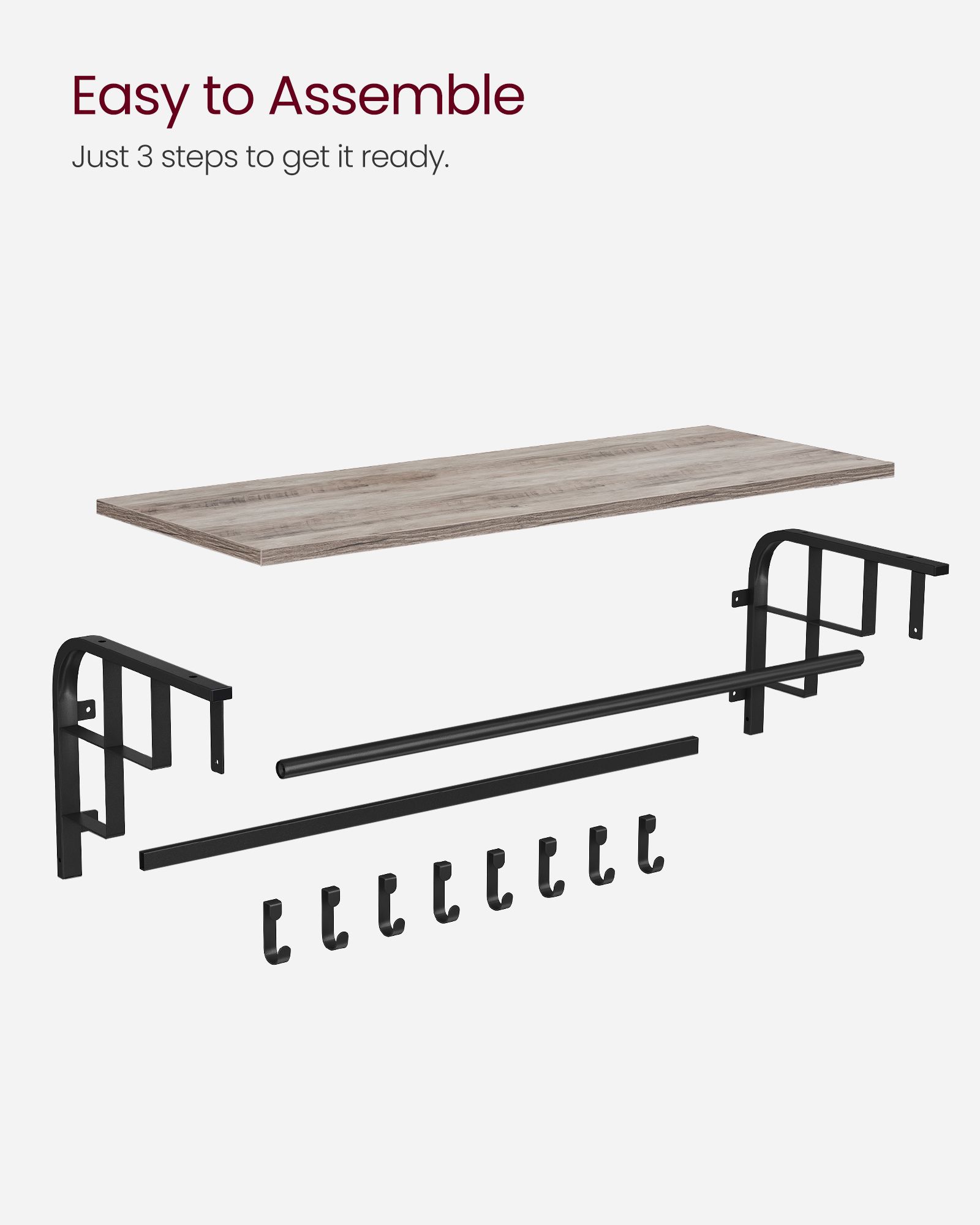 This VASAGLE wall-mounted coat rack offers a stylish and practical storage solution. Featuring a greige and black finish with 5 hooks, it's perfect for entryways or bedrooms. The LCR101W09 model boasts an oak and white design with a shelf and 10 removable hooks, ideal for organizing coats, hats, and accessories in various rooms.