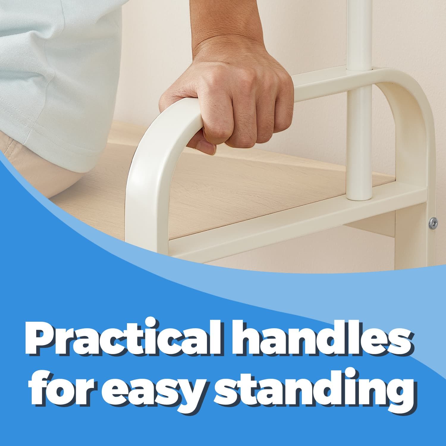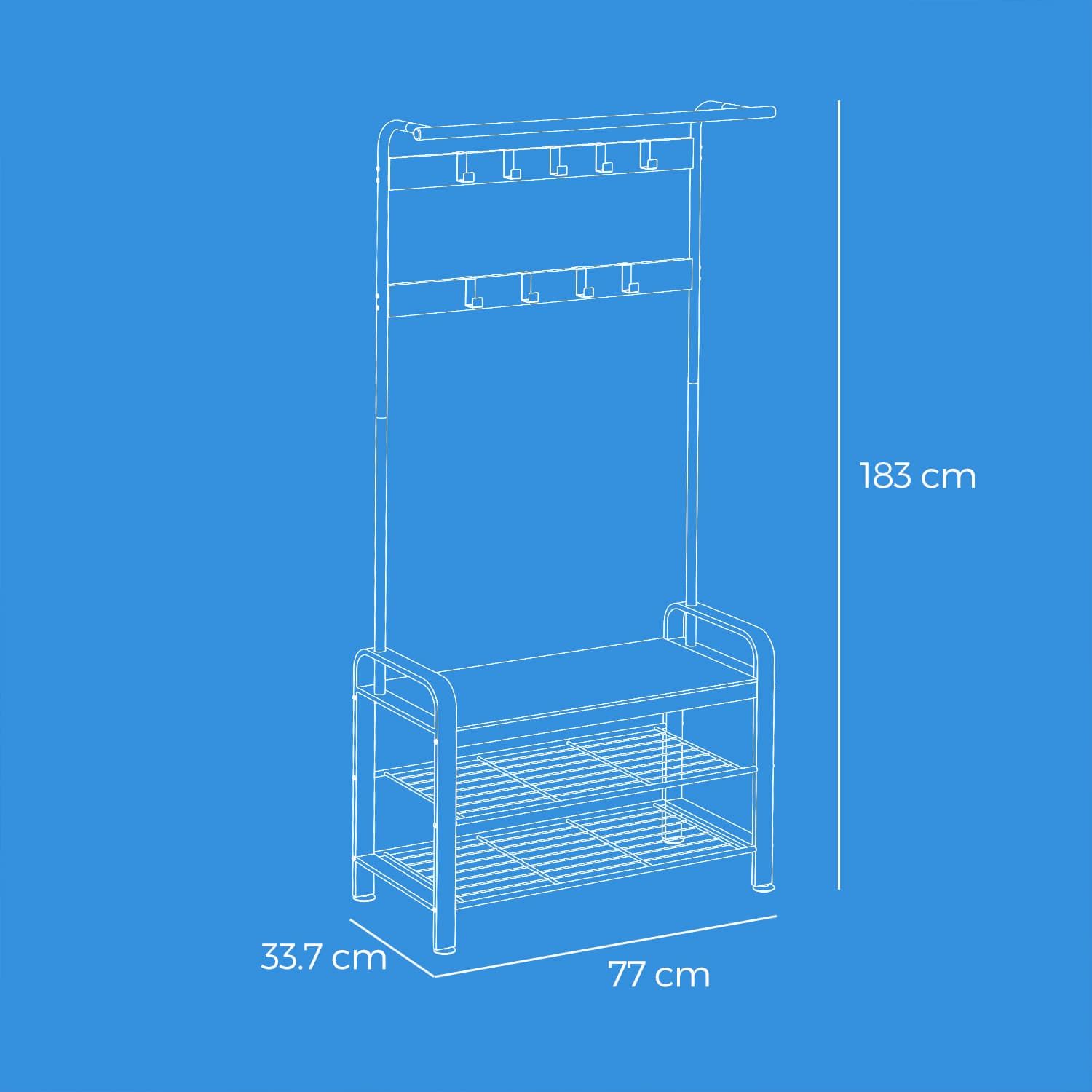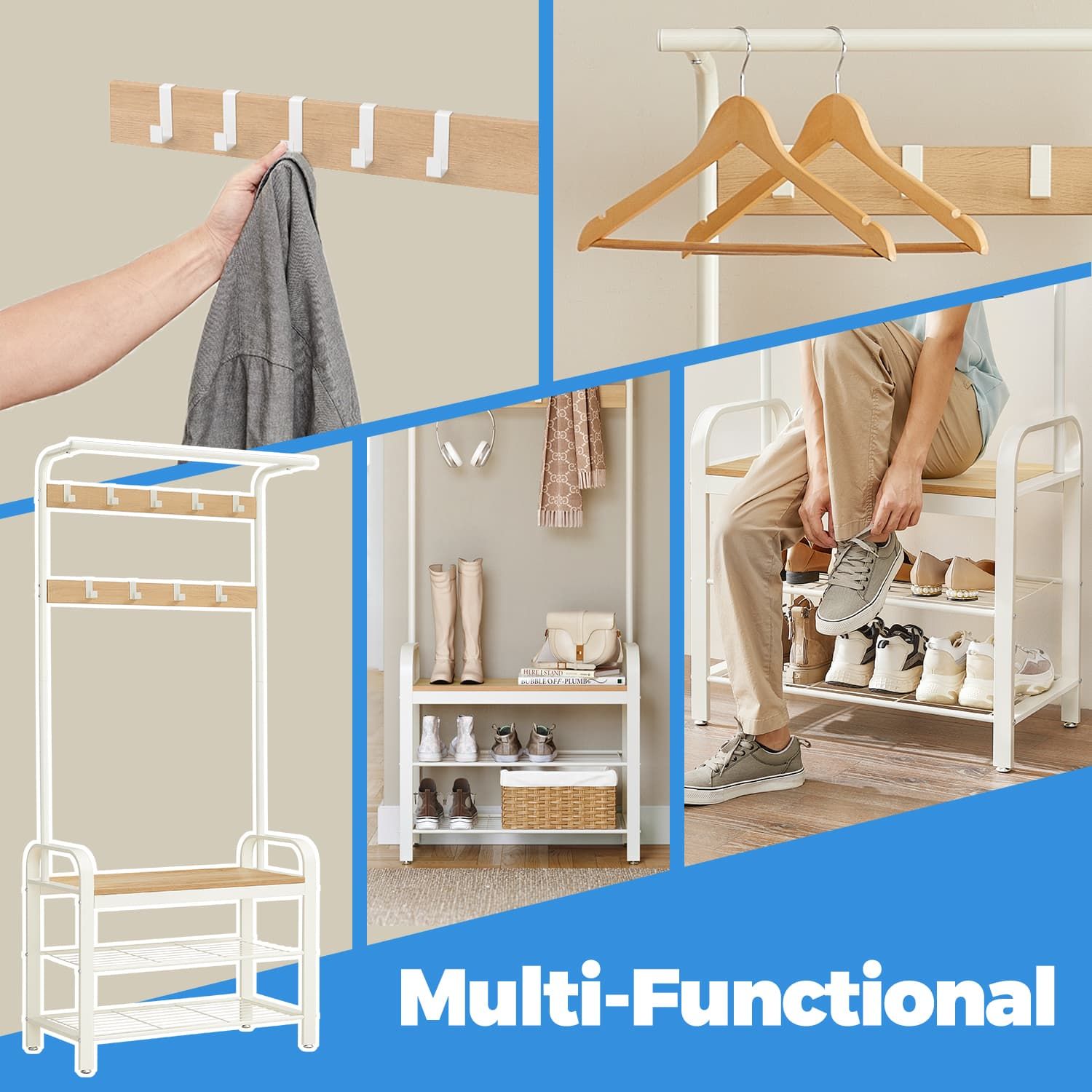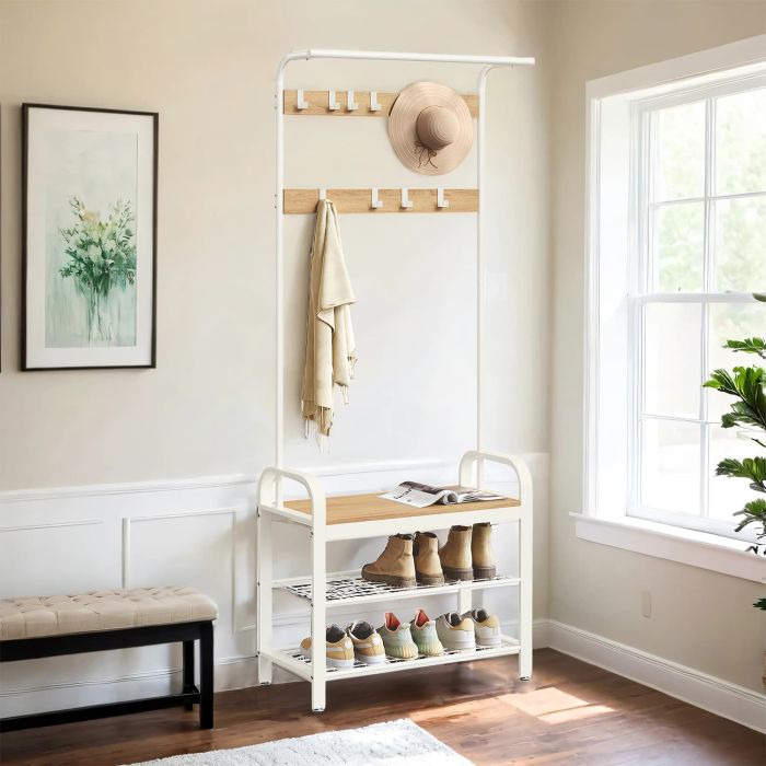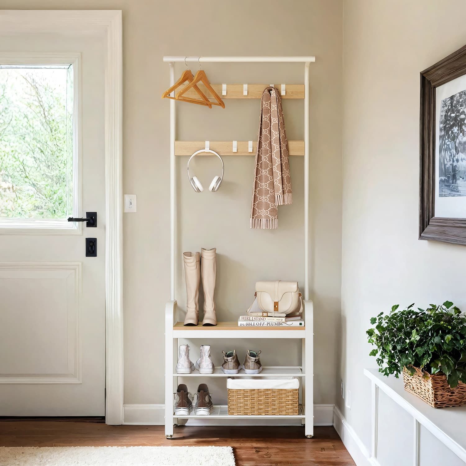 Coat Rack - TARVA Stand with Shoe Storage Bench 9 Removable Hooks - White