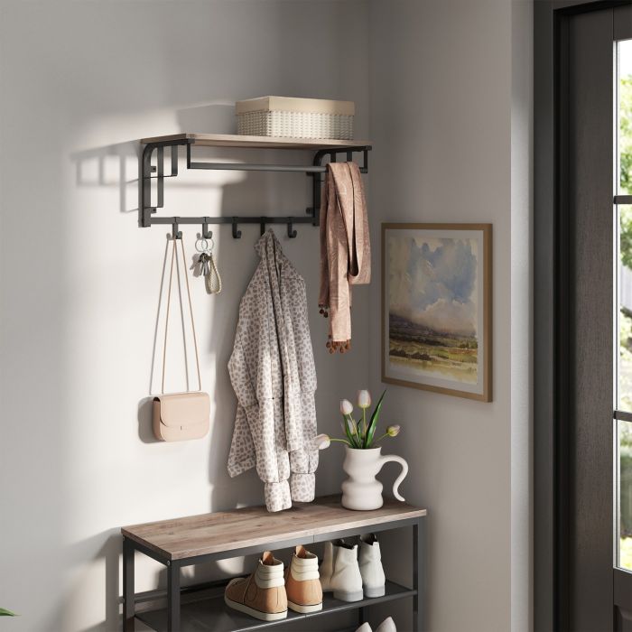 Coat Rack - VERRA Wall Mounted Clothes Rail with 5 Removable Hooks and Shelf - Light Wood
