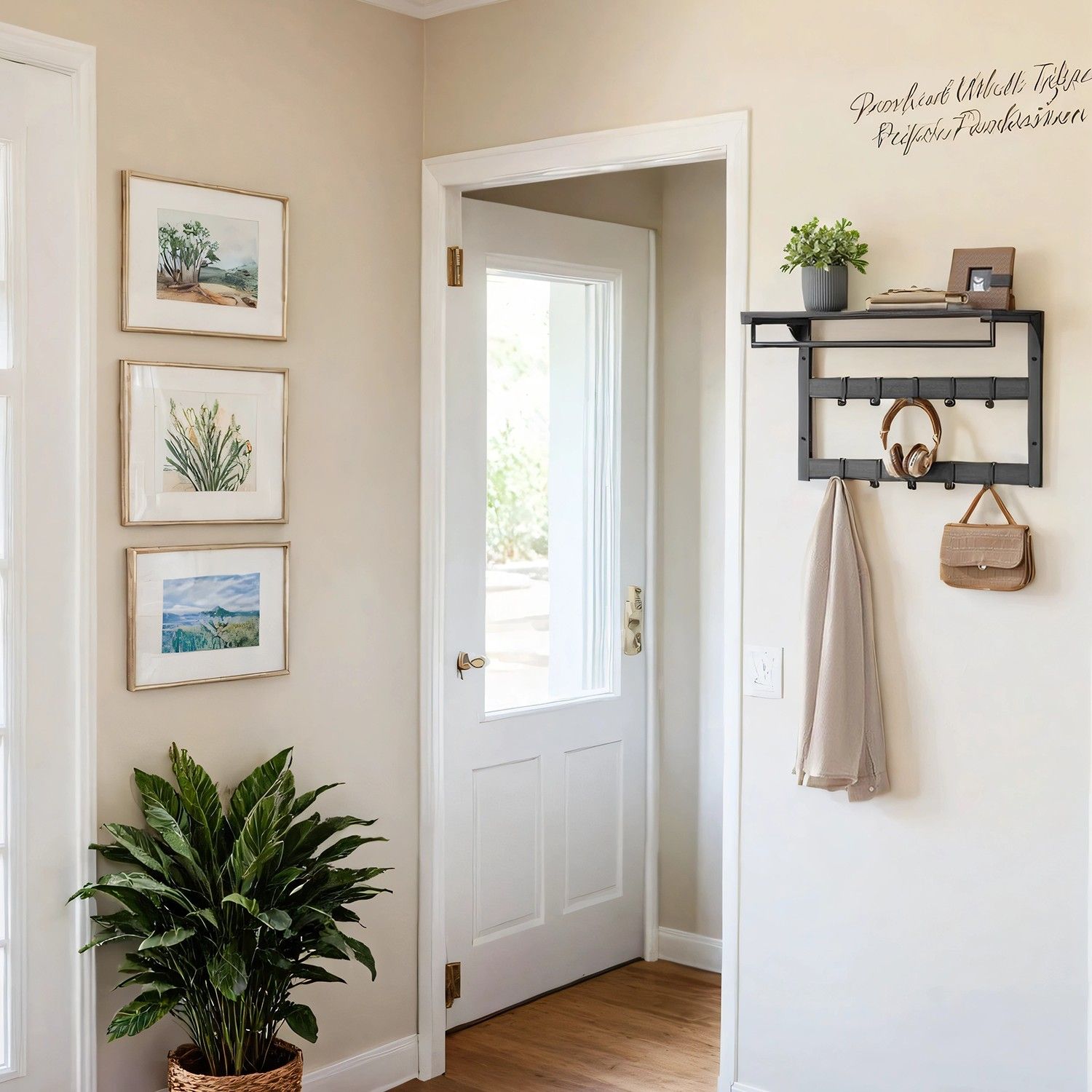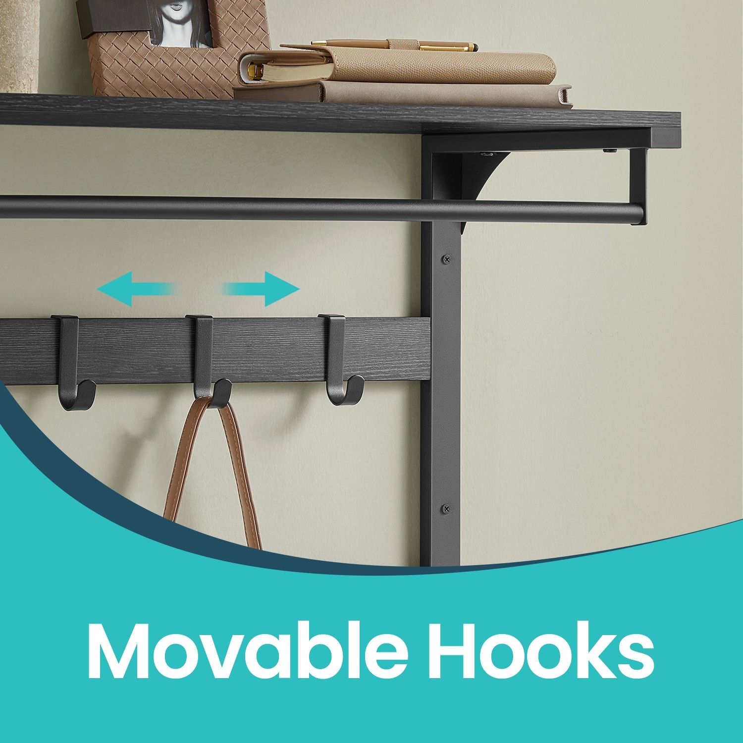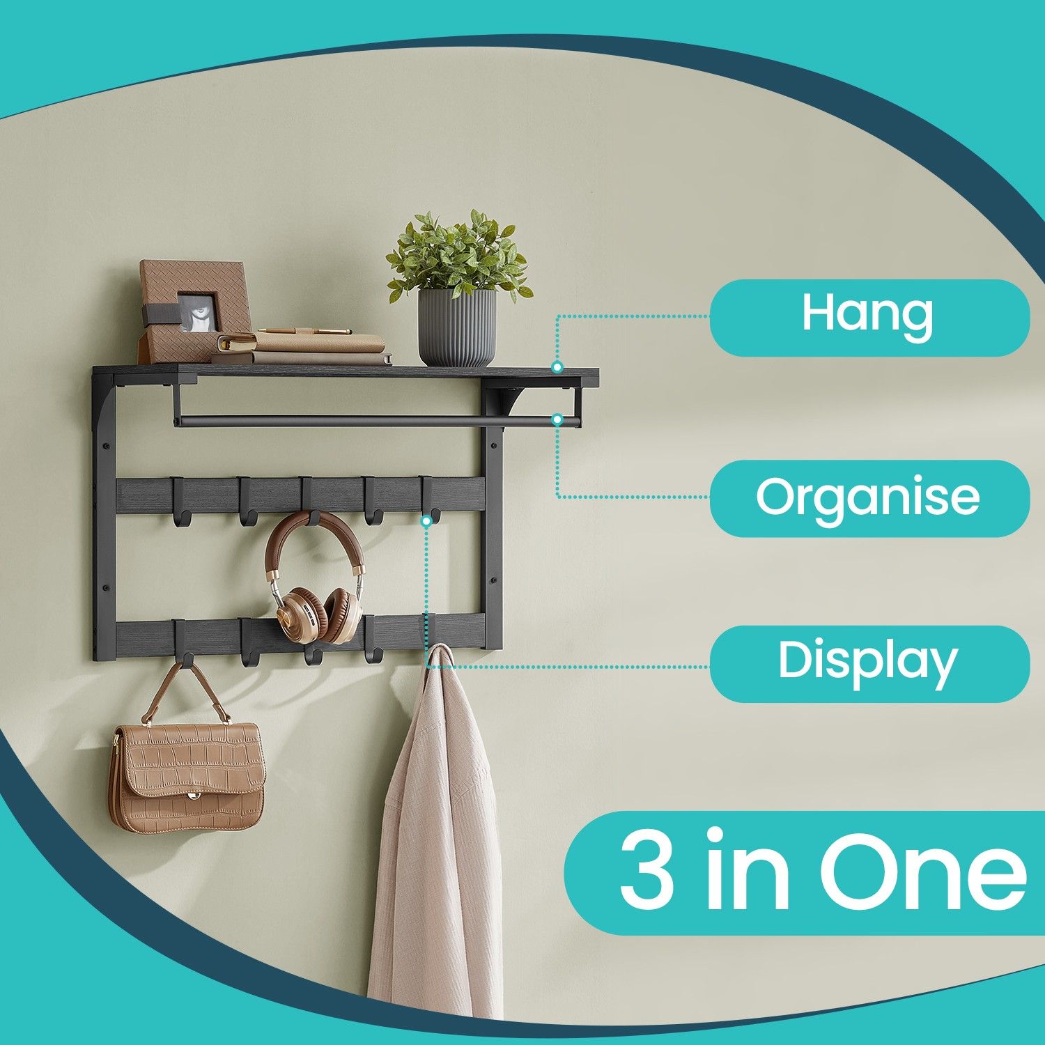 This versatile wall-mounted coat rack and shelf offers a stylish storage solution. Featuring a sturdy shelf for displaying items and 10 removable hooks, it's perfect for organizing coats, hats, bags, and more in hallways, bedrooms, or entryways. Available in Oak Colour and White/Greige, Black/Rustic Brown and Black, it seamlessly blends functionality with modern design.