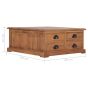 This colonial-style wooden coffee table, made of solid teak, will add a touch of rustic charm to your interior. It can also be used as a side table or end table. The coffee table has a sturdy hardwood table top, on which you can place decorative items like fruit baskets or vases. The 4 drawers provide ample space for keeping all kinds of smaller items organised and within reach. Important note: Colours and grains may vary from piece to piece, making each of our coffee table unique. The delivery is random.