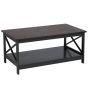 Featuring a modern urban style, this unique coffee table is sure to add a touch of elegance to your home. Featuring smooth rectangular table top made from easy-care MDF with Okoume wood veneer and a decorative feature on the side. The practical shelf underneath lets you store your belongings away and keep the table top clutter-free. A black finish and dark brown top create a sophisticated look that will complement beautifully other decors in the room. Details: Color: Black. Main material: MDF. Additional material: MDF. Weight: 17 Assembly: Full Assembly Required Weight Capacity: 10 Legs Height: 45