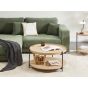 This round coffee table combines natural charm with modern design. The top features a tray-like shape, with both the top and lower shelf showcasing a natural-looking wood-knot effect for added warmth and texture. Its sturdy black metal frame ensures stability and style, while plastic caps protect your floors from scratches. Perfect for storing essentials or displaying decorative items, this versatile table adds a touch of nature-inspired elegance to any living space.