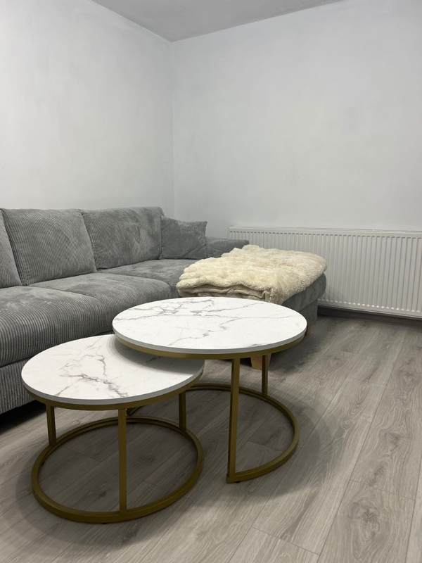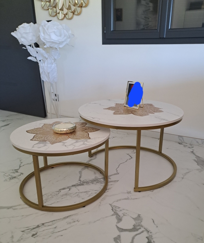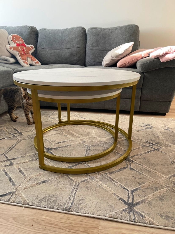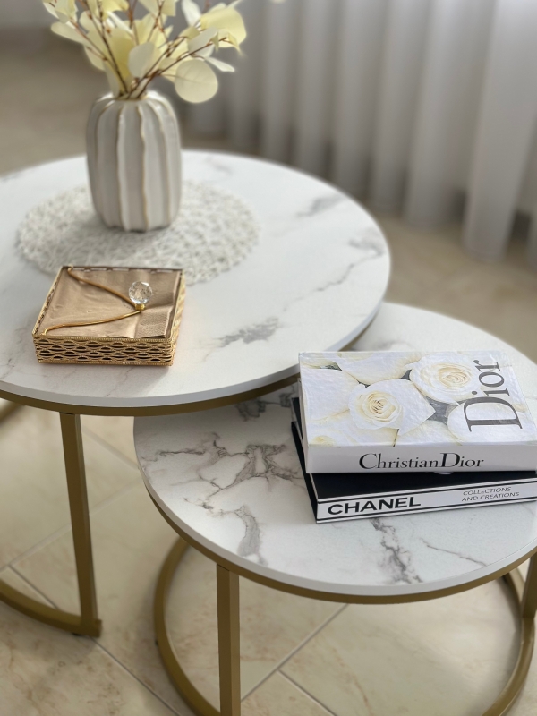 Coffee Table Set of 2, Round Nest of Tables with Faux Marble Tabletop and Metal Frame, Modern Side Tables for Living Room, White