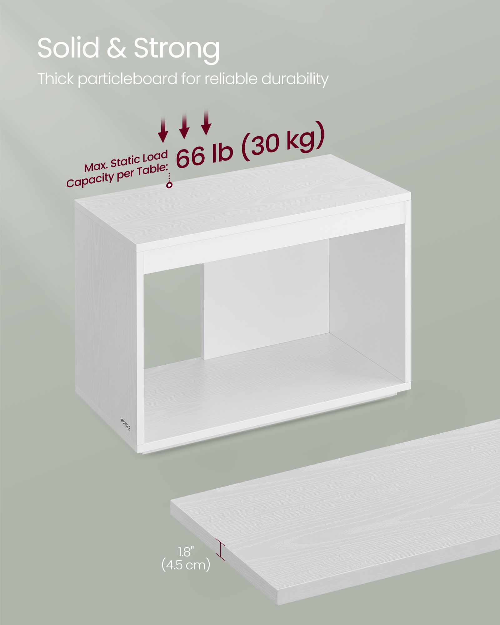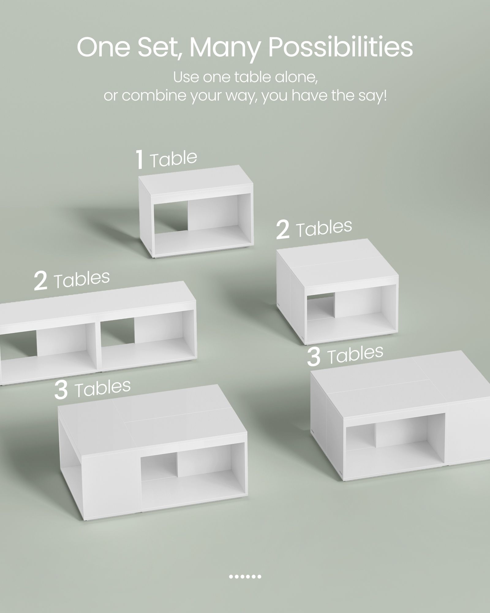Elevate your space with this customizable 3-piece coffee table set in a chic Snow White finish. Perfect for living rooms, bedrooms, or studies, these modern rectangular tables offer versatile arrangement options and a convenient storage shelf. Mix and match sizes to create your ideal configuration, adding both style and functionality to your home.