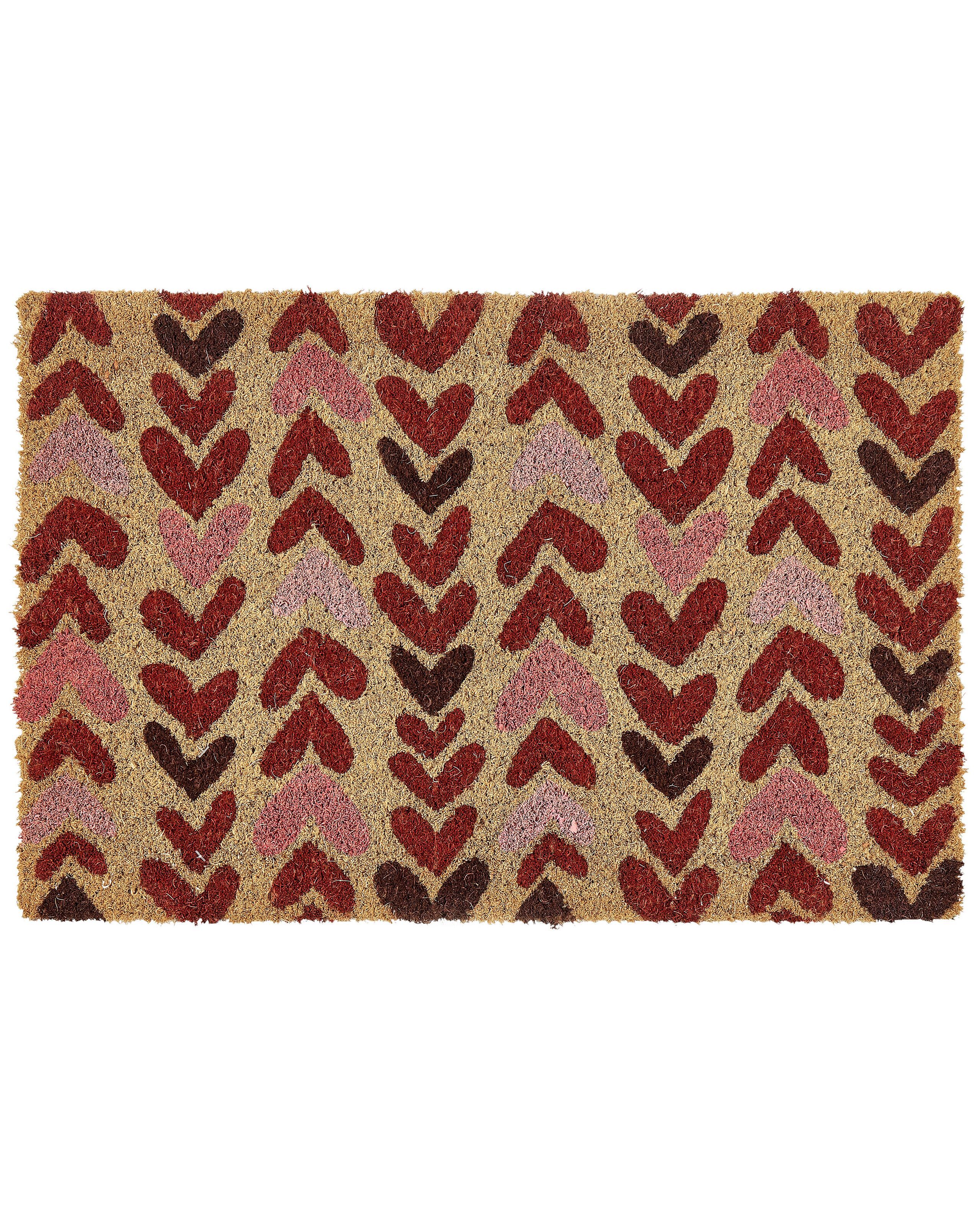 This rectangular doormat, crafted meticulously from organic coir fibres, elevates both functionality and aesthetics of the hallway. Delicately adorned with a charming heart motif in a palette of pink and red hues, this mat with its environmentally-conscious construction adeptly traps dirt and moisture. Enhanced with a robust anti-skid base, it assures not only safety but also long-lasting resilience. Details: Color: Natural, Red, Pink. Main material: Coir. Material Composition: 100% Coir Weight: 1.4 Assembly: Does Not Require Assembly