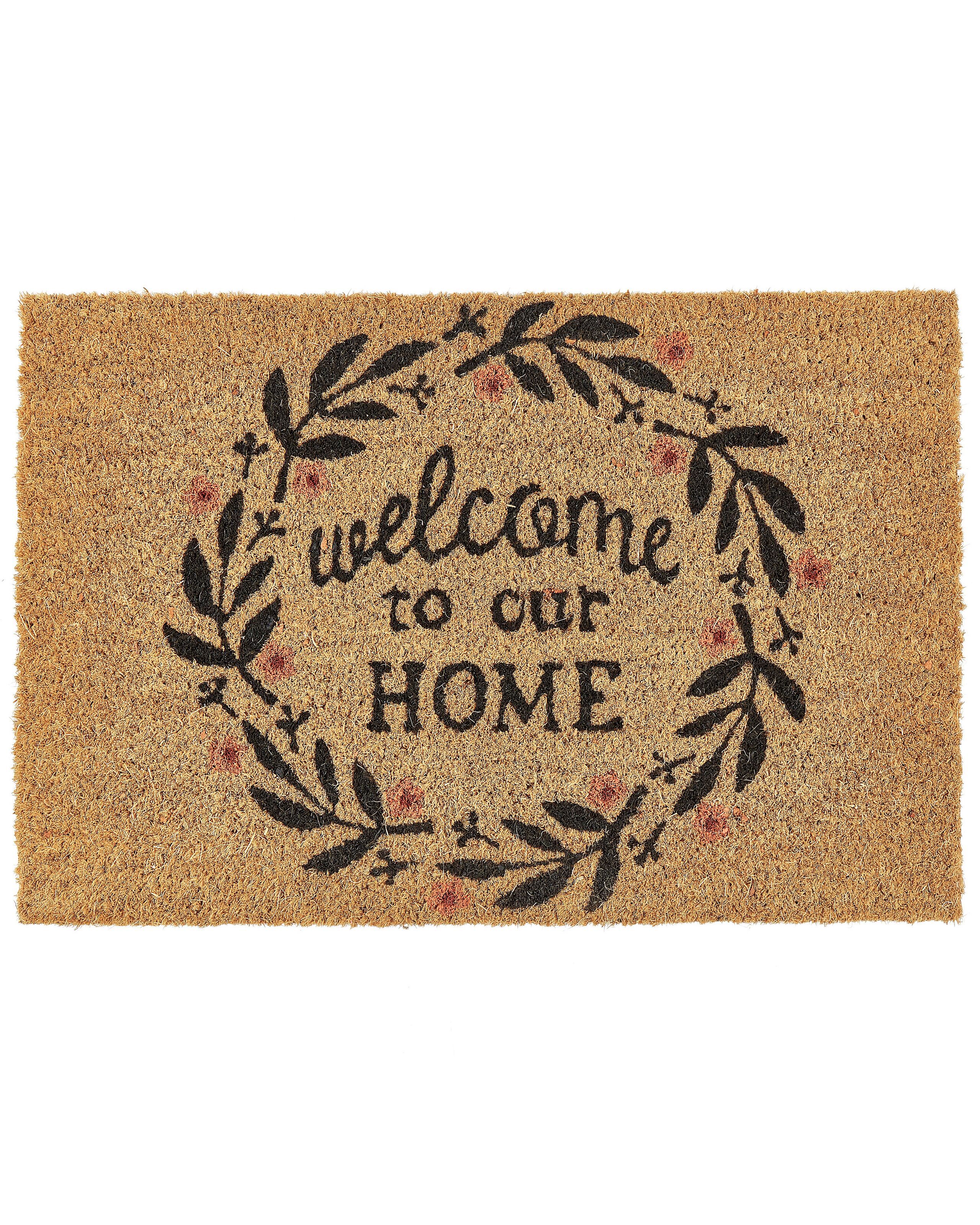 This natural coir doormat keeps your home clean and dry. Welcoming you with a charming caption, this mat exudes warmth at your doorstep. The bottom keeps it from slipping, making it safe to use. Details: Color: Natural, Pink, Black. Main material: Coir. Material Composition: 100% Coir Weight: 1.4 Assembly: Does Not Require Assembly