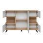 The Bogota sideboard stands out with its unusual but highly functional structure. It has a 16mm laminated board carcass with a push-to-open system mechanism replacing the traditional handles system. The cabinet is very space-saving with a pair of open compartments at the sides for decorations, multiple one-compartment hinged doors and a large shelving space at the center.