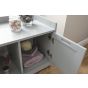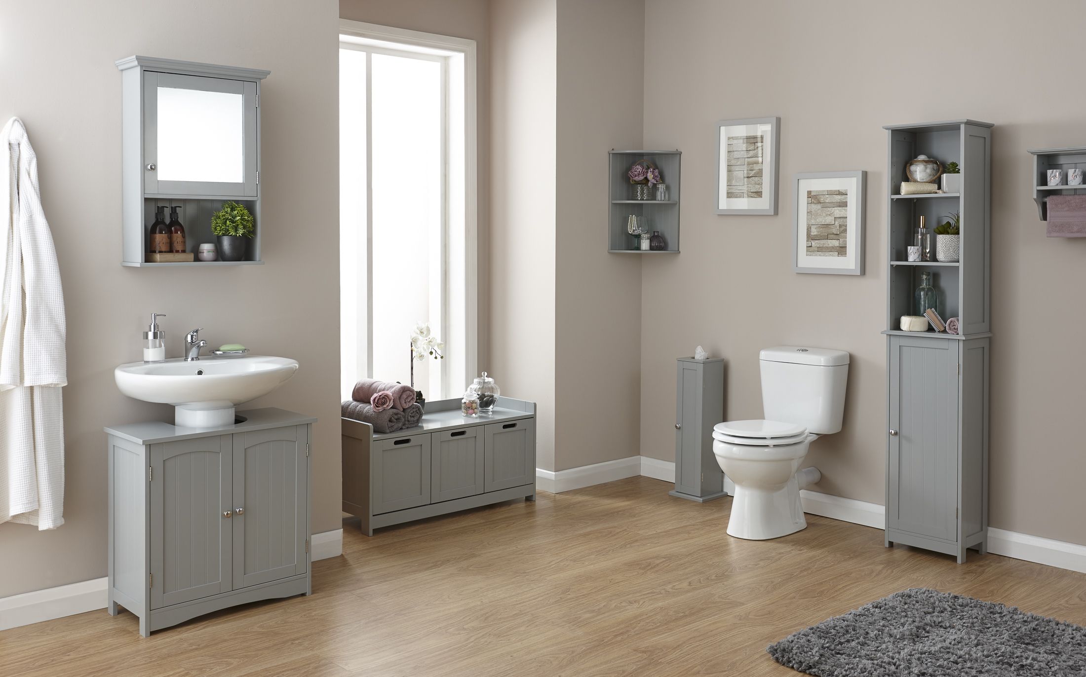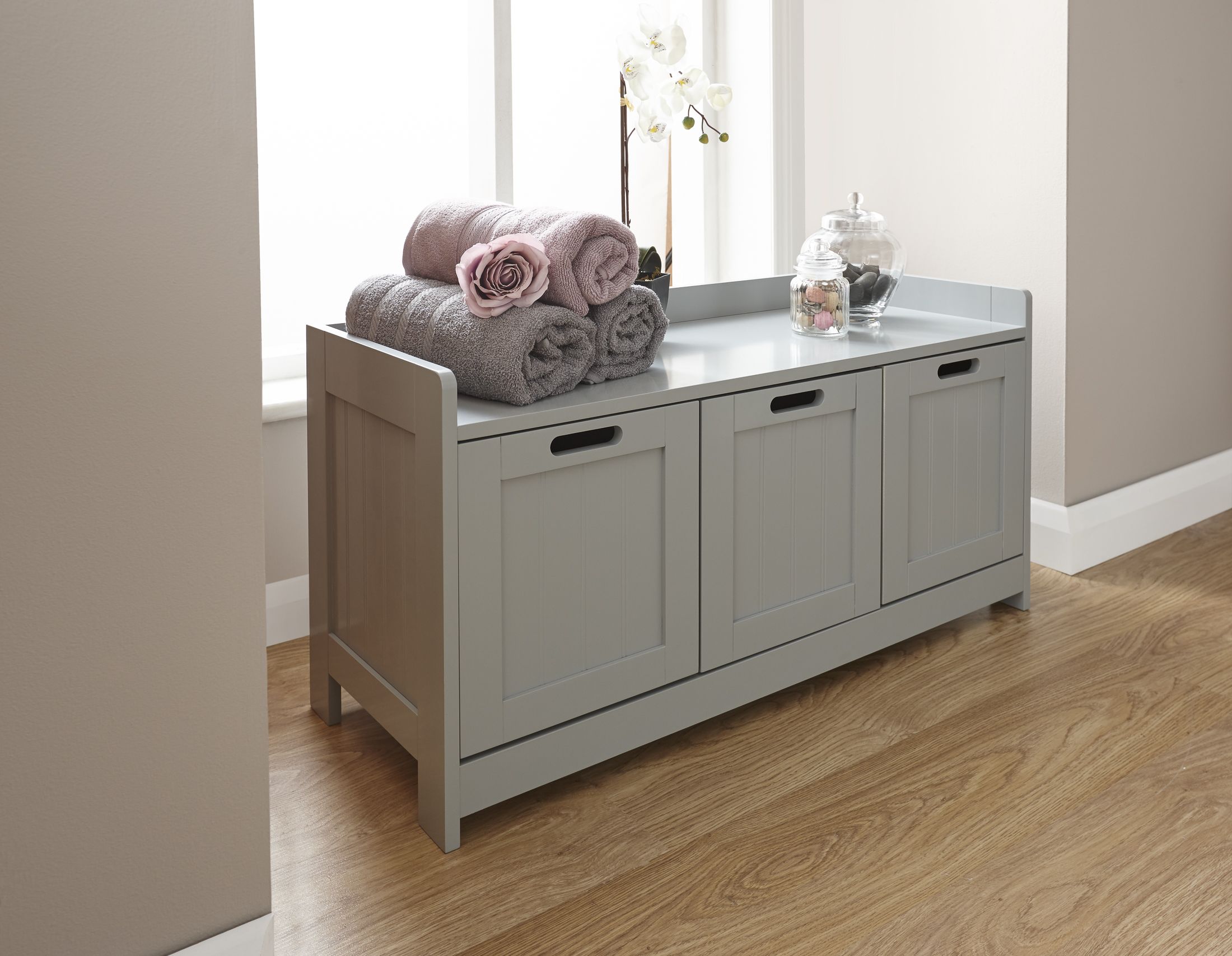 The key to a clutter-free bathroom is planning ample storage for everyday essentials. If space allows, this smart storage bench in a choice of white or grey paint finishes is a super-practical choice. The chic colonial-style furnishing piece creates a handy resting place but it makes the most of every centimetre of space by incorporating three tongue-and-groove panelled doors that are ideal for clean bath linen or toiletry supplies.