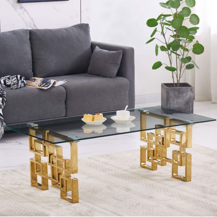 Elevate your living space with the exquisite Comet Carter Glass Coffee Table featuring stunning clear glass and opulent gold legs. Crafted to perfection, this table exudes elegance and sophistication, making it a focal point in any modern home. The sleek rectangular design offers ample surface area for displaying decor or serving snacks, while the sturdy stainless steel legs in a luxurious gold finish add a touch of glamour. Whether placed in your living room or lounge area, this coffee table is sure to impress guests and enhance the ambiance of your space.