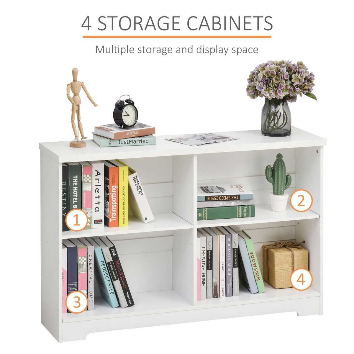 - Features four compartments for plenty of storage and display space