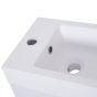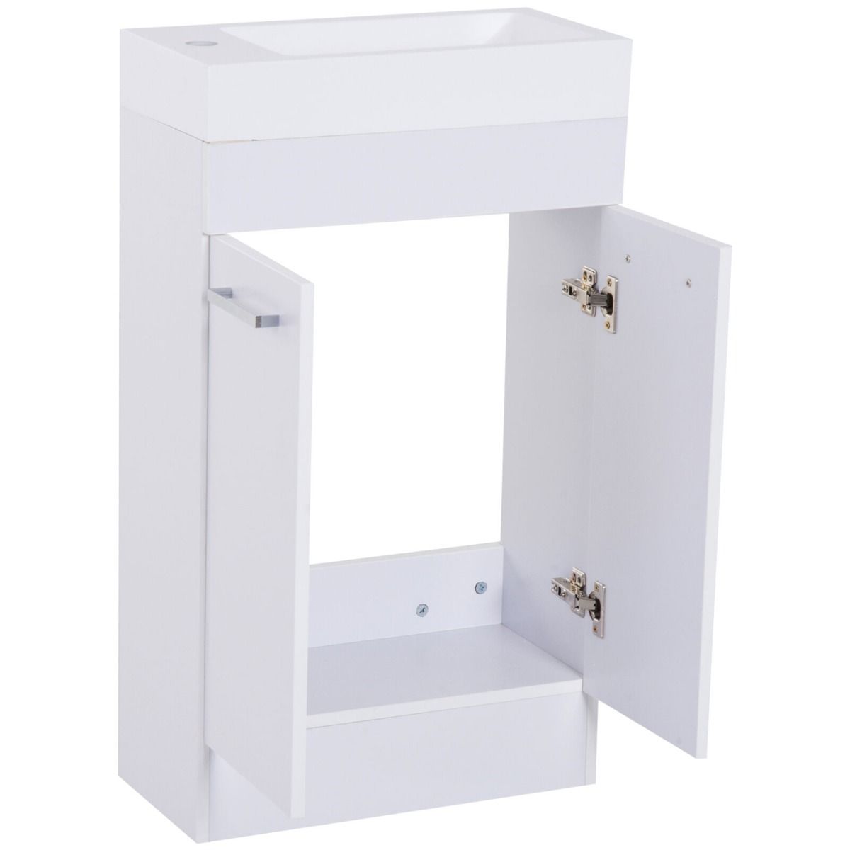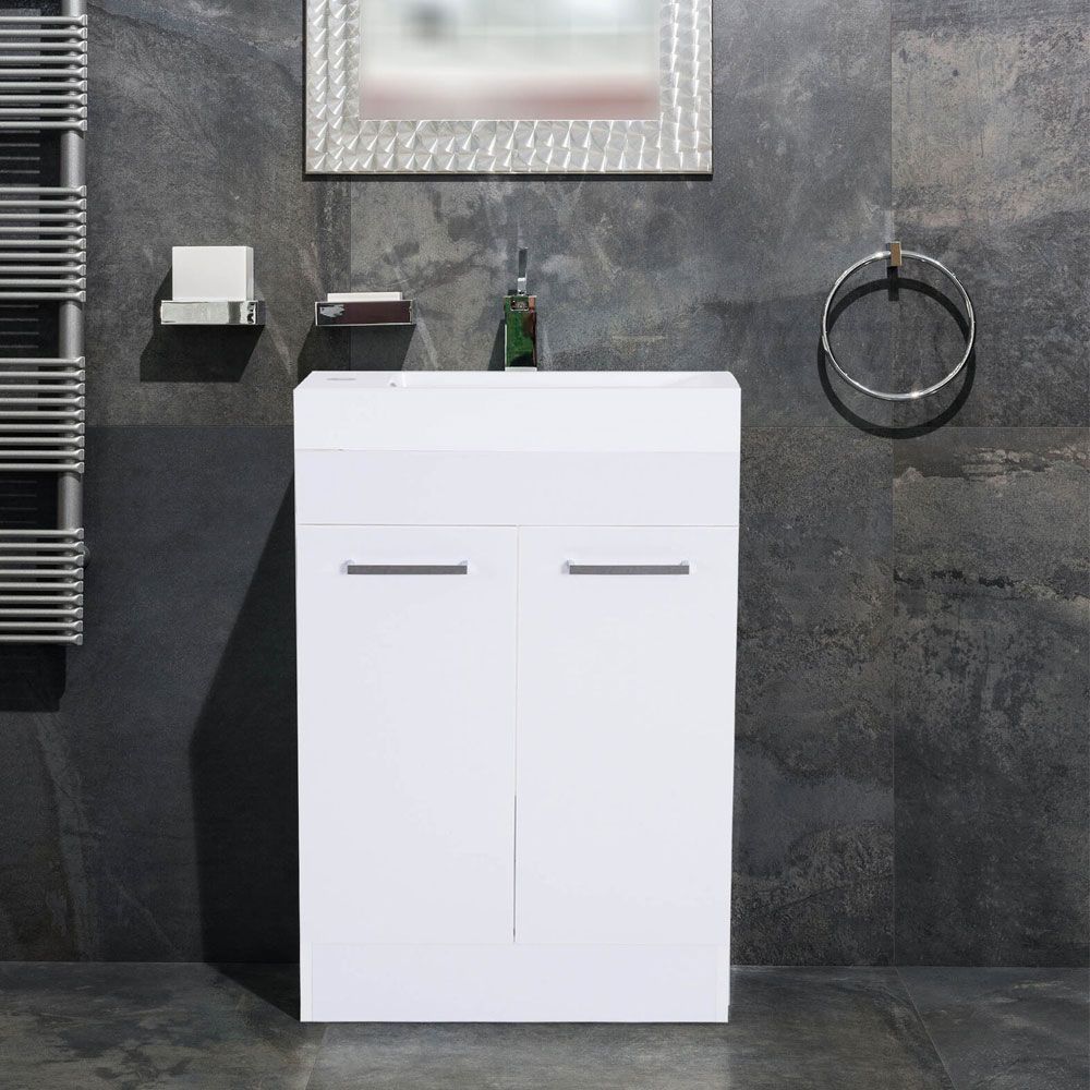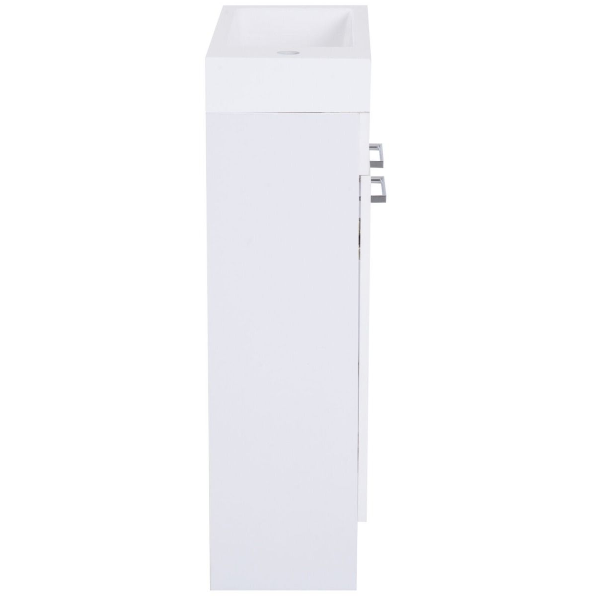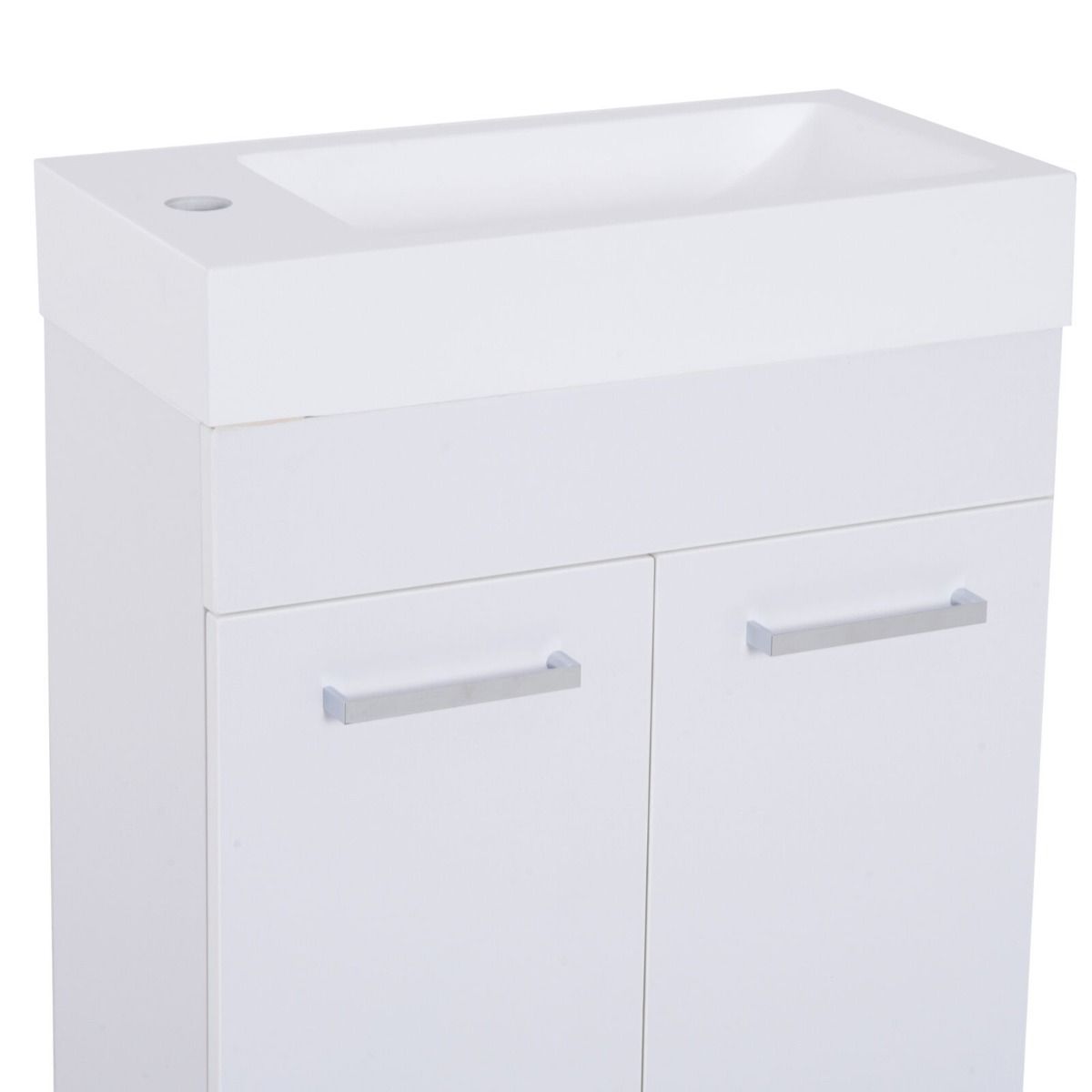 The freestanding unit comes in white finish with a reversible washstand with a standard size tap hole. The cabinet has a 2-door cupboard with chrome metal handles for easy opening and closing. The whole set is a stylish and functional furniture that will enhance your bathroom decor.