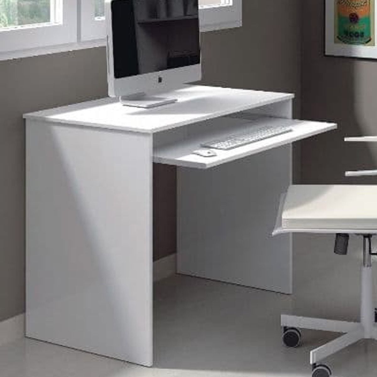 Introducing the Small White Desk, a compact yet functional addition to any home or office space. This desk features a minimalist design, perfect for smaller areas where space is limited. The pull-out keyboard tray adds convenience, allowing for easy access and organization of your workspace essentials.