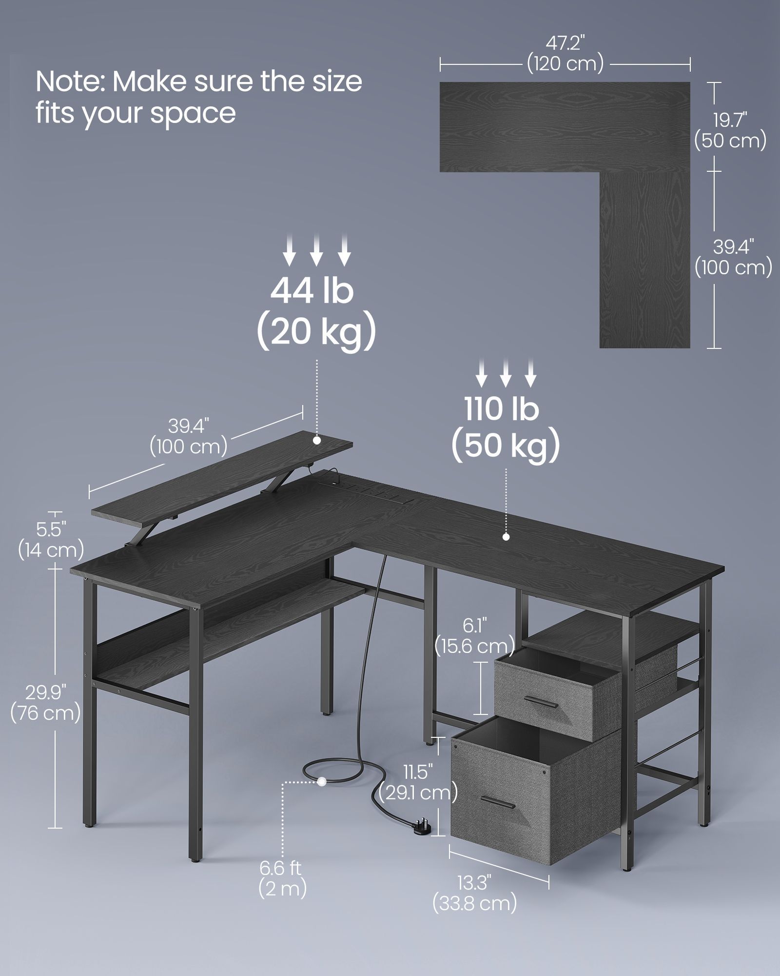Computer Desk - FINLIA L-Shaped with Power Outlet - Ebony Black