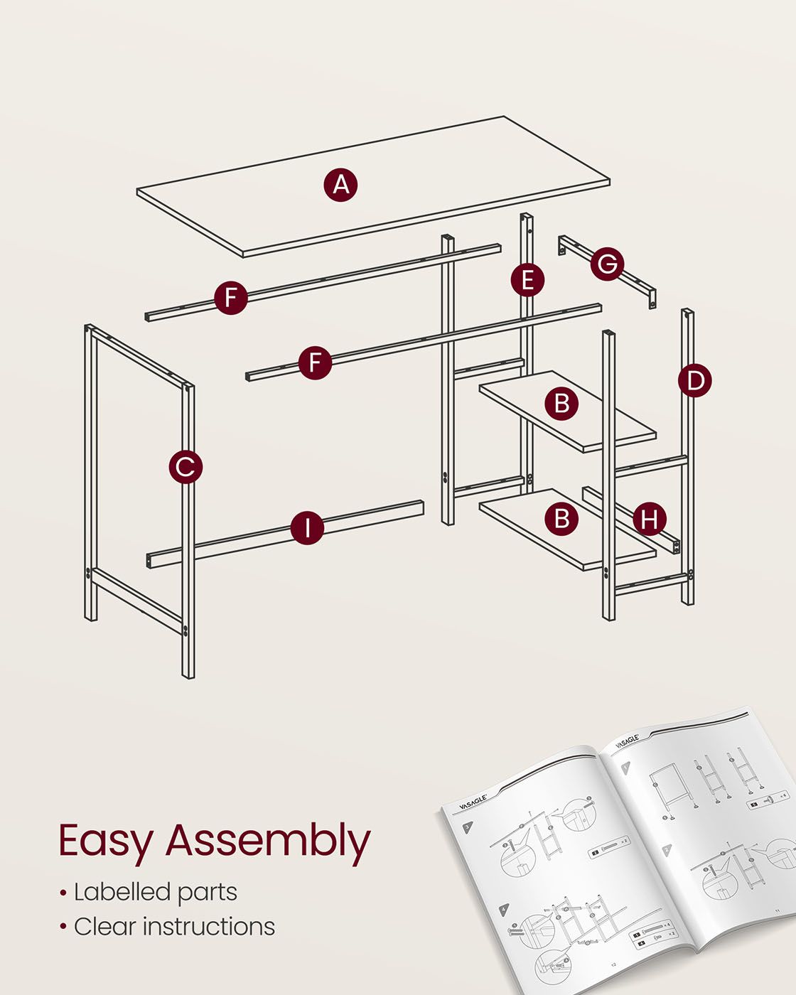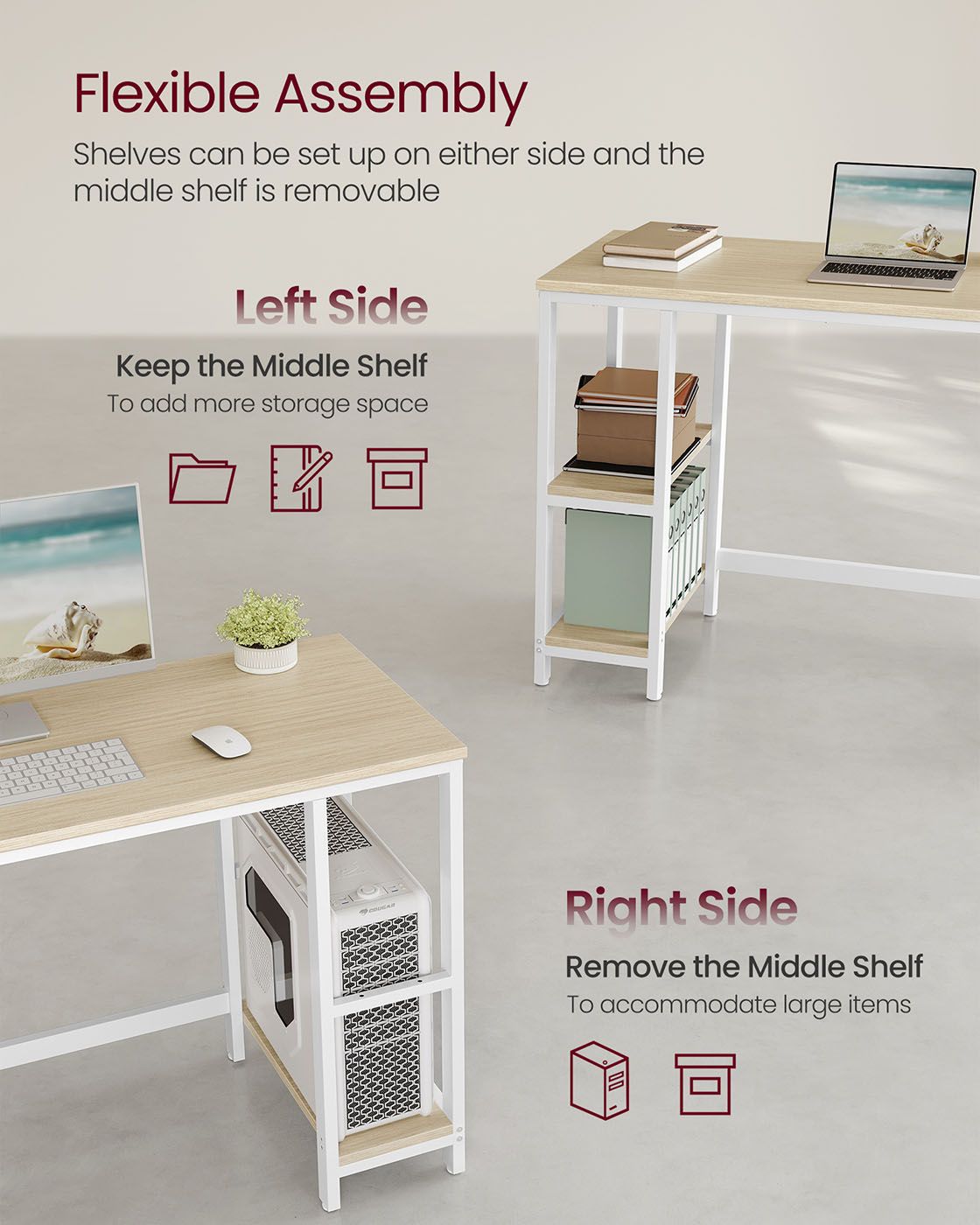 Computer Desk - FINLIA Wide Desk with 2 Shelves - Beige and Pearl White