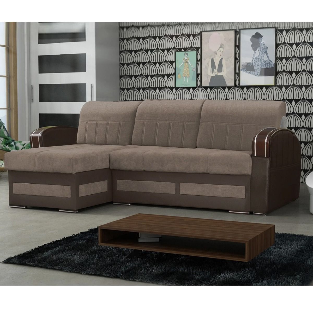 Corner Sofabed - CALVIN Fabric 3 Seater L Shaped Left Hand - Brown