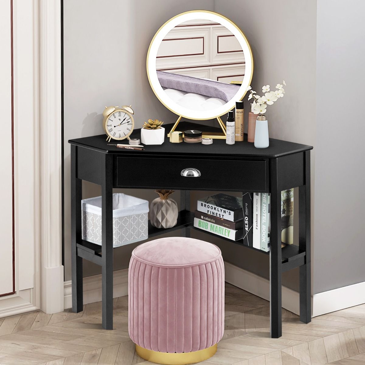 Corner Table / Computer Desk with Drawer and Shelves-Black
