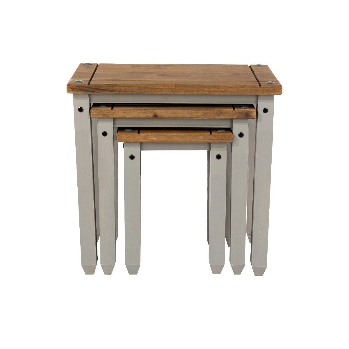 The Corona Mexican pine Nest of Tables is a high quality, durable that is accented with understated decorative black metal studs. Finished with a base coat which seals into the wood the rustic effect which is typical of this style, followed by a spirit based wax coating which is polished in by hand. The simple and attractive design of these tables also makes them easy to match the surrounding decor.