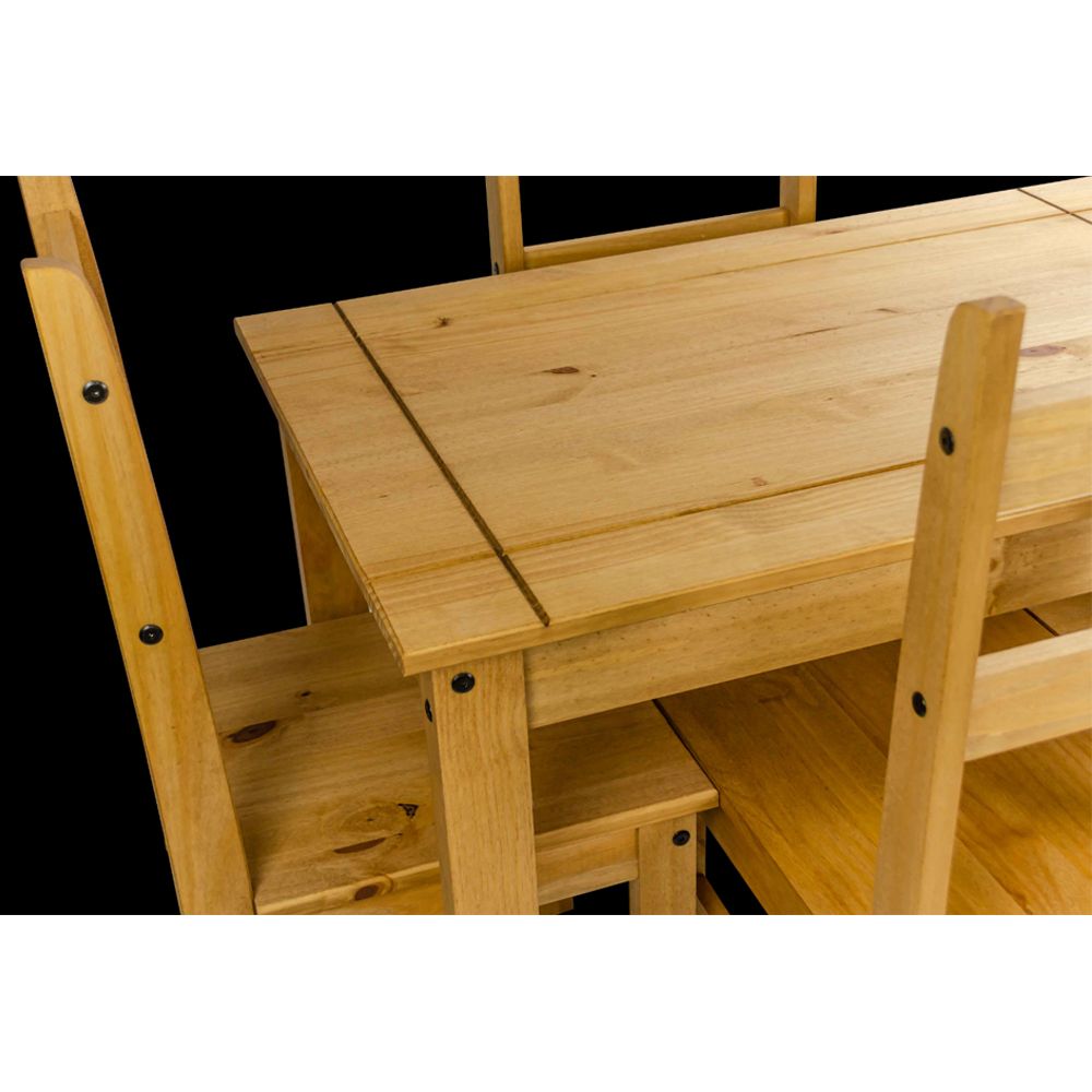 The extremely competitive and compact dining table with four chairs makes the popular Mexican look affordable for everyone. The range is expertly crafted from solid pine and hand waxed to protect, preserve as well as enhance the grain. It offers outstanding value for money that would be a welcome addition to any home.