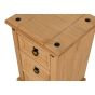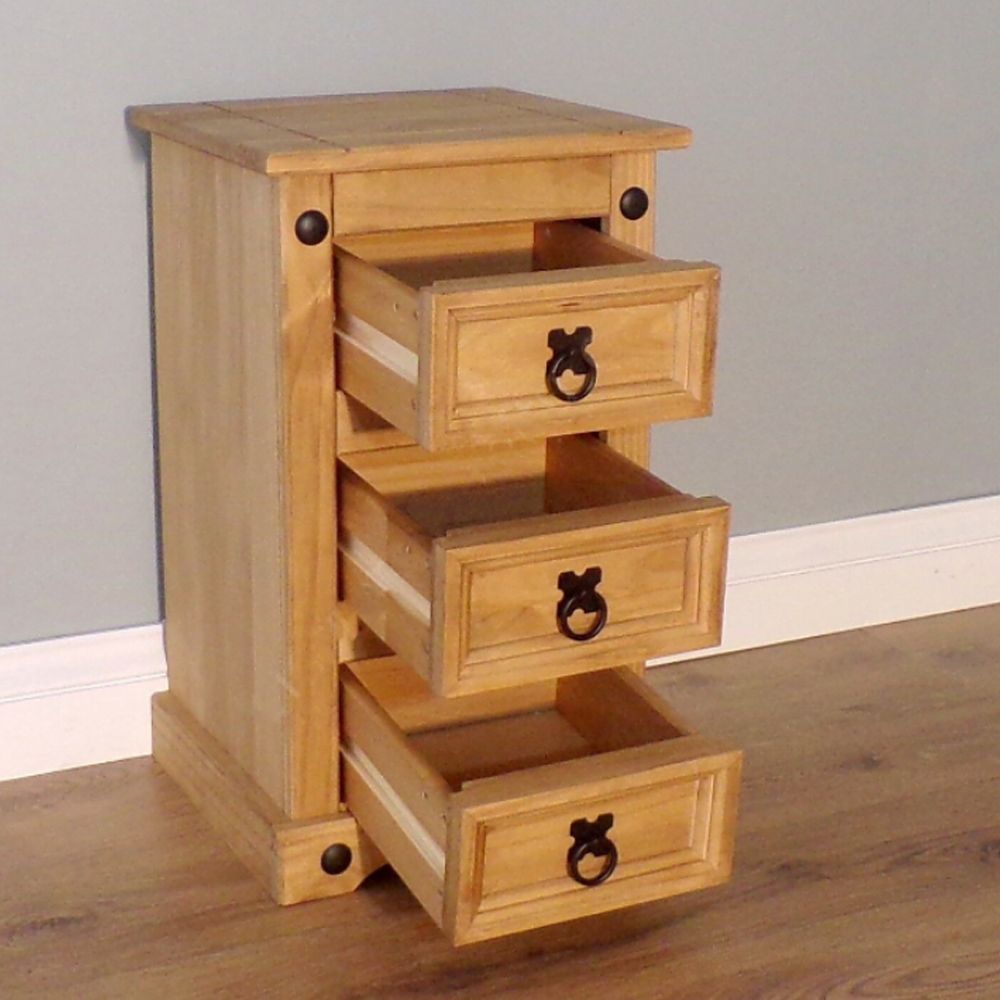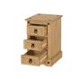 A Mexican style solid pine 3 drawer bedside chest with hardboard drawer bases and unit back panel. Real black metal handles, hinges and studs.