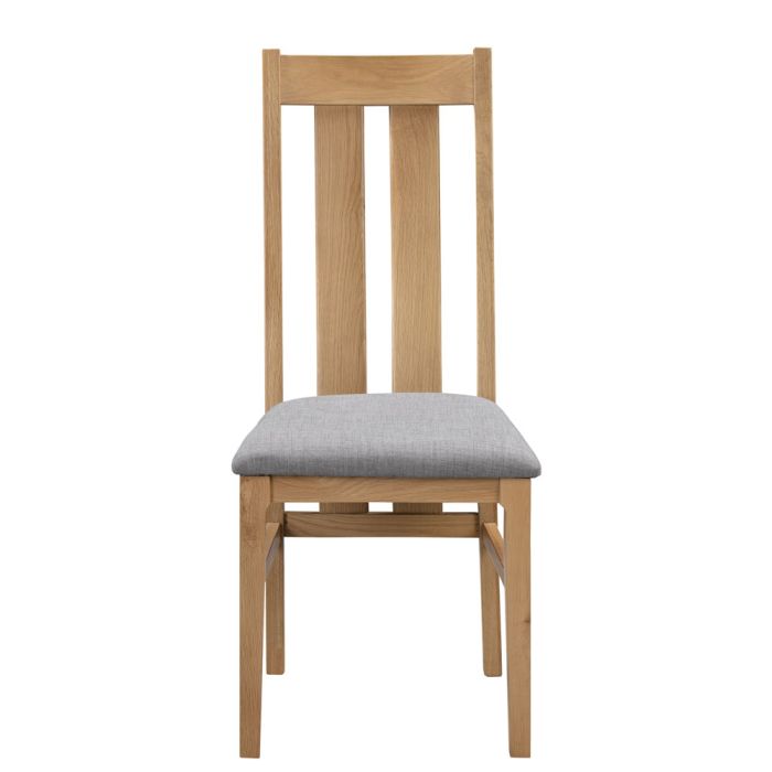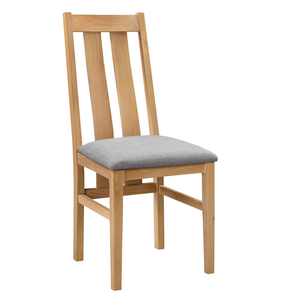 Featuring a slatted back that is angled for support, the Cotswold Dining Chair combines comfort with durability and strength. Crafted from solid oak and oak veneers with an upholstered grey linen seat pad, this dining chair excels in a traditional, yet elegant design.