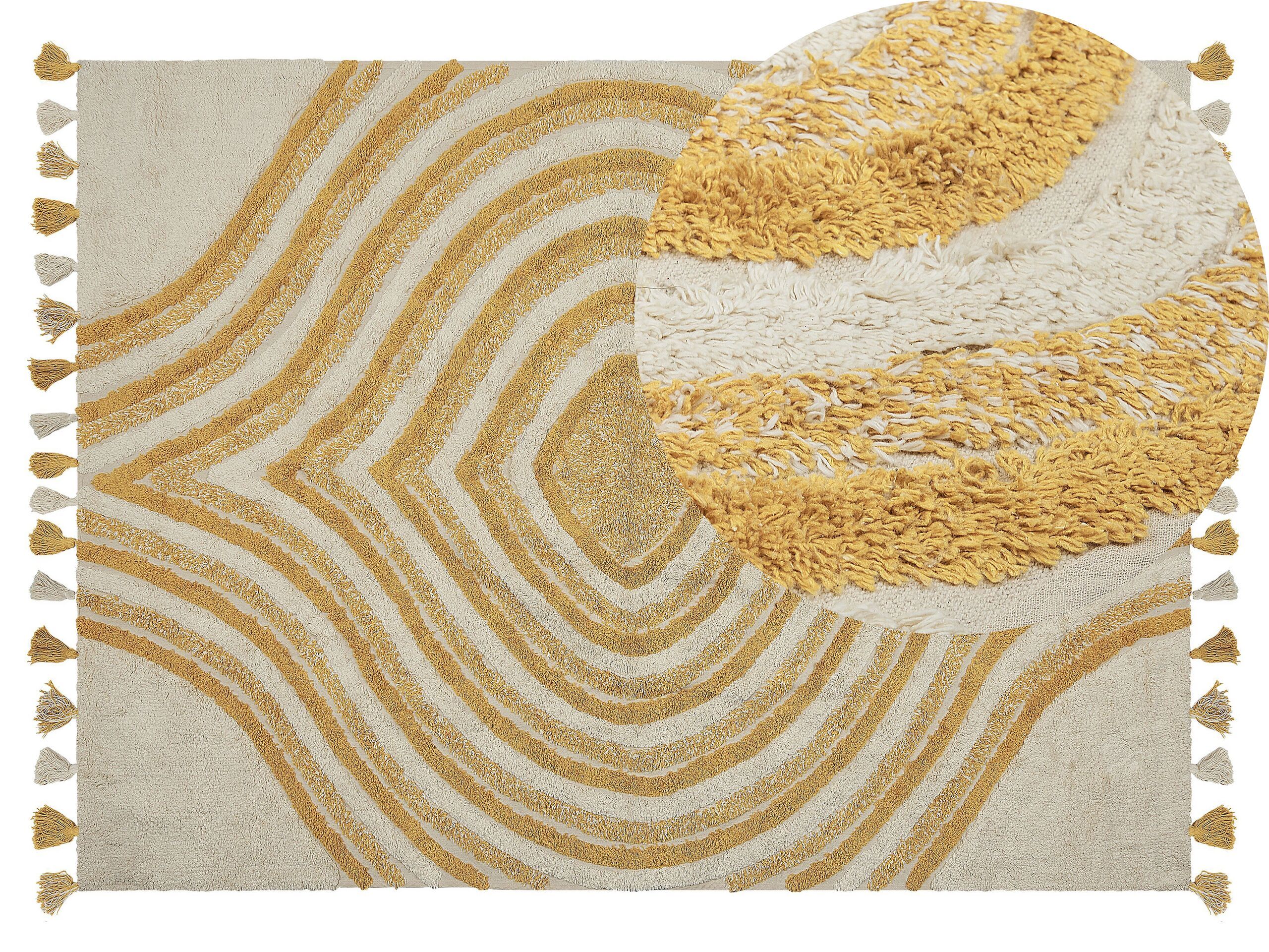 The abstract pattern and decorative tassels on the sides are what makes this rug so intriguing and enchanting. If you want to introduce a modern feel to your room, then this rug is a great choice. Moreover, it is hand tufted from cotton thanks to which you will upgrade not only the look but also the comfort. Place it next to your sofa or bed to create a truly eye-catching centrepiece Details: Color: Beige, Yellow. Main material: Cotton. Material Composition: 100% Cotton Weight: 3.6 Assembly: Does Not Require Assembly