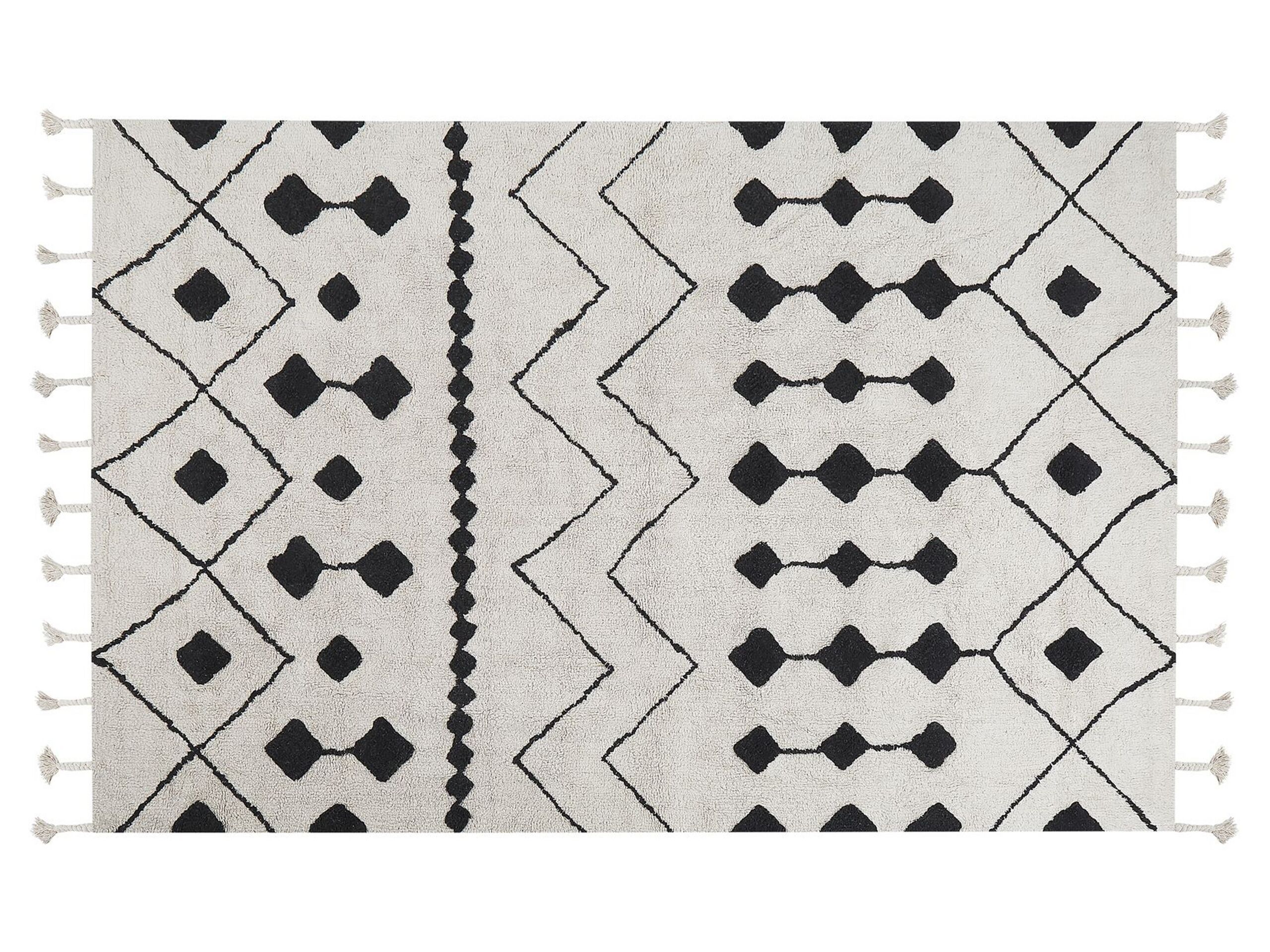 A stylish rug of high quality can be a nice finishing touch that will complete the look of the whole room. This piece comes with a minimalist geometric pattern and decorative tassels, which add an oriental feel that nicely complements modern or boho interiors. Thanks to the precise hand-tufting and durable cotton fibre, this rug will please the eye for years to come. Details: Color: White, Black. Main material: Cotton. Material Composition: 100% Cotton Weight: 5.8 Assembly: Does Not Require Assembly