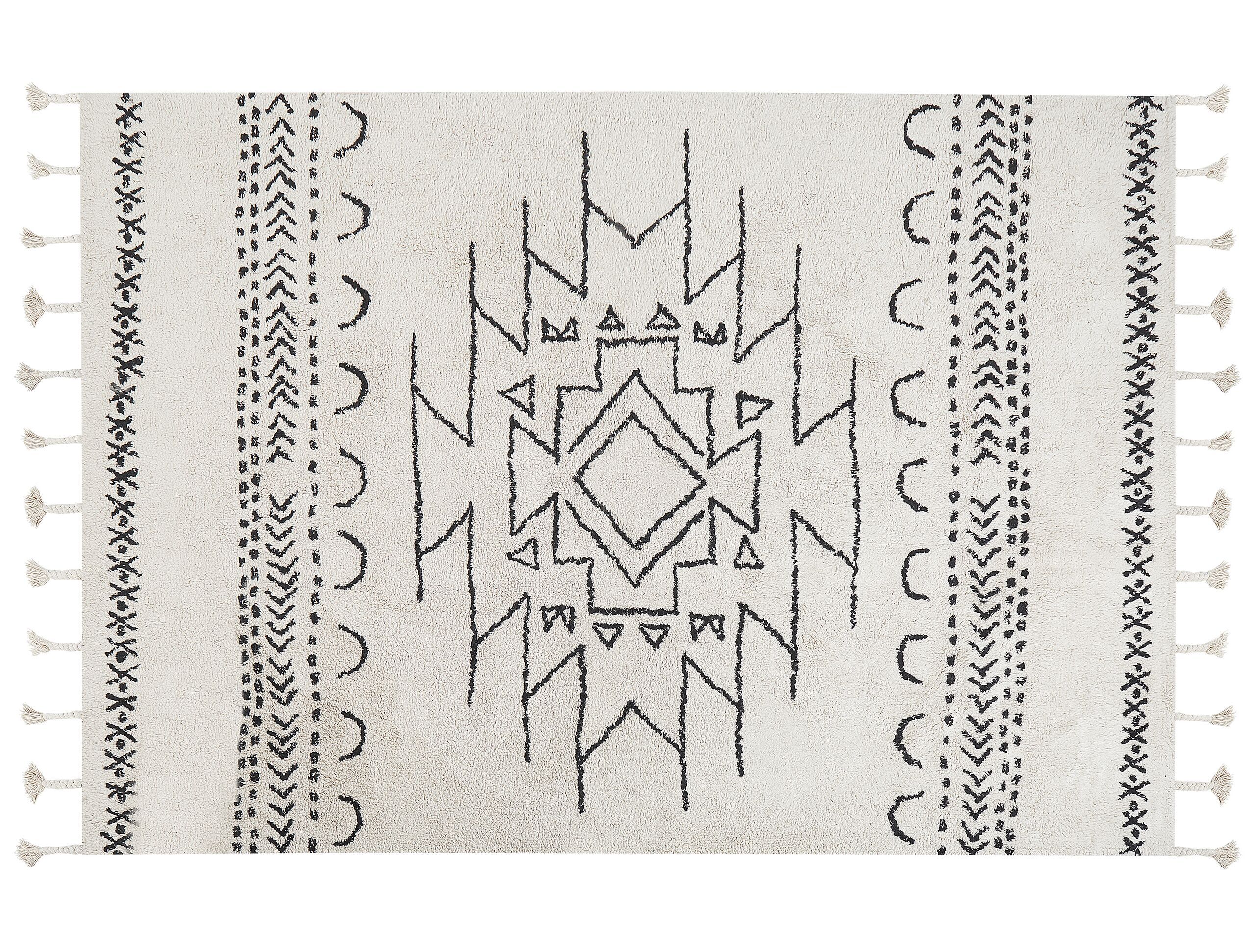 Place this rug next to your bed or sofa, so you can experience its softness anytime you step on the floor. The piece is soft and durable thanks to the fact that it was hand-tufted with utmost precision from high-quality cotton. Inbuilt tassels and a geometric pattern add an oriental feel that will nicely complement modern interiors. Details: Color: White, Black. Main material: Cotton. Material Composition: 100% Cotton Weight: 5.2 Assembly: Does Not Require Assembly