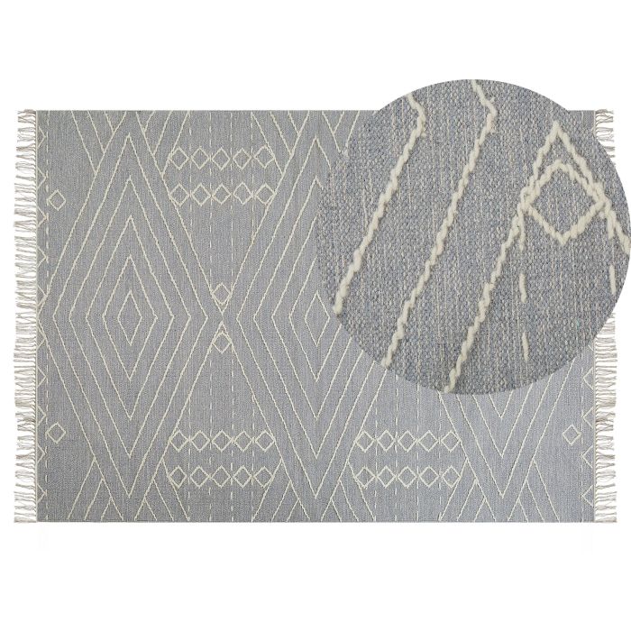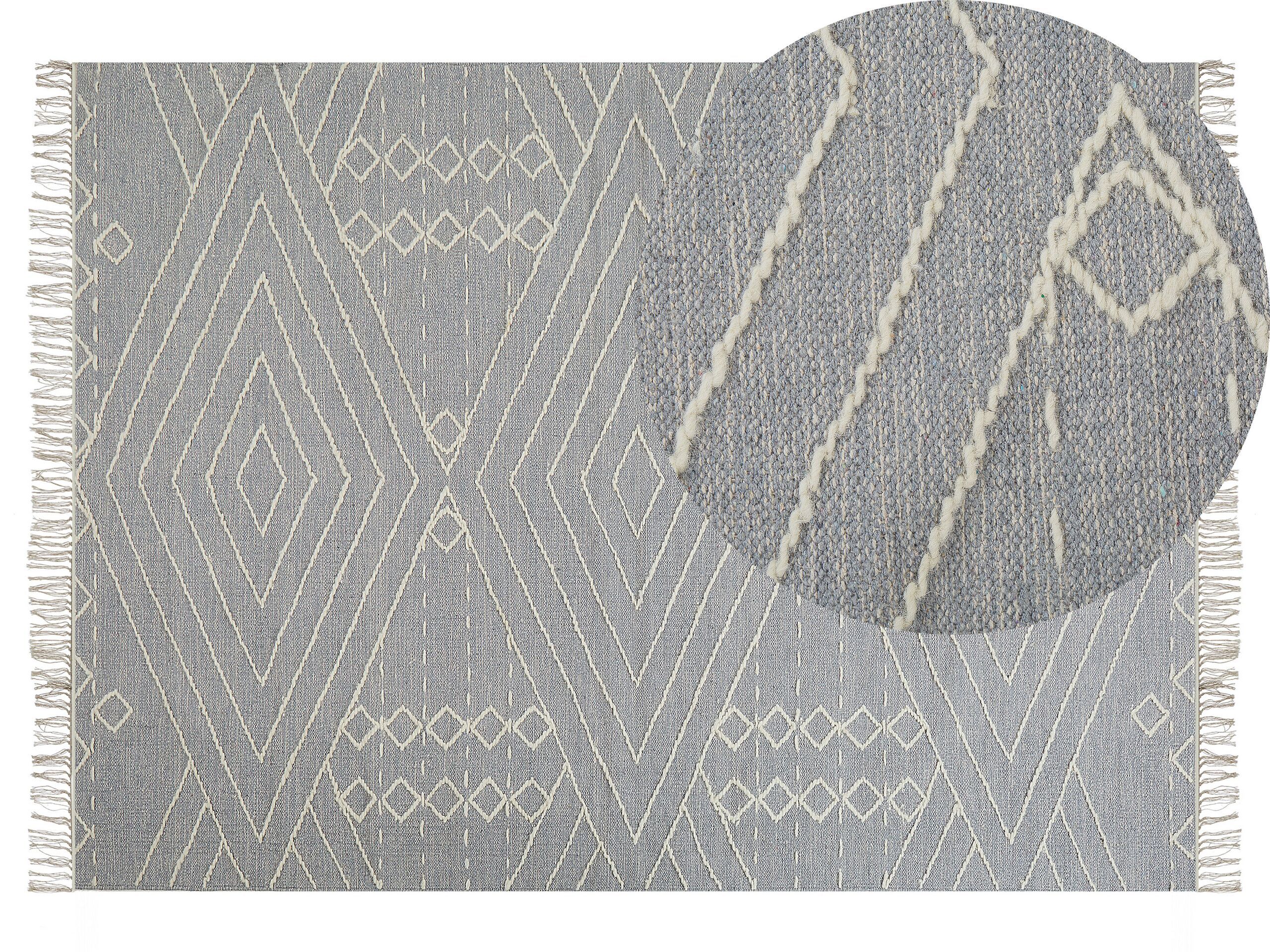 Add an eye-catching accent to your living room or bedroom, which at the same time will create a cosy atmosphere. This handmade rug is crafted from high-quality cotton as well as wool for durability. The geometric pattern and tassels boost the oriental feel of the piece that will nicely work with boho interiors. Details: Color: Grey, White. Main material: Cotton. Additional material: Wool. Material Composition: 30% Wool, 70% Cotton Weight: 4.6 Assembly: Does Not Require Assembly