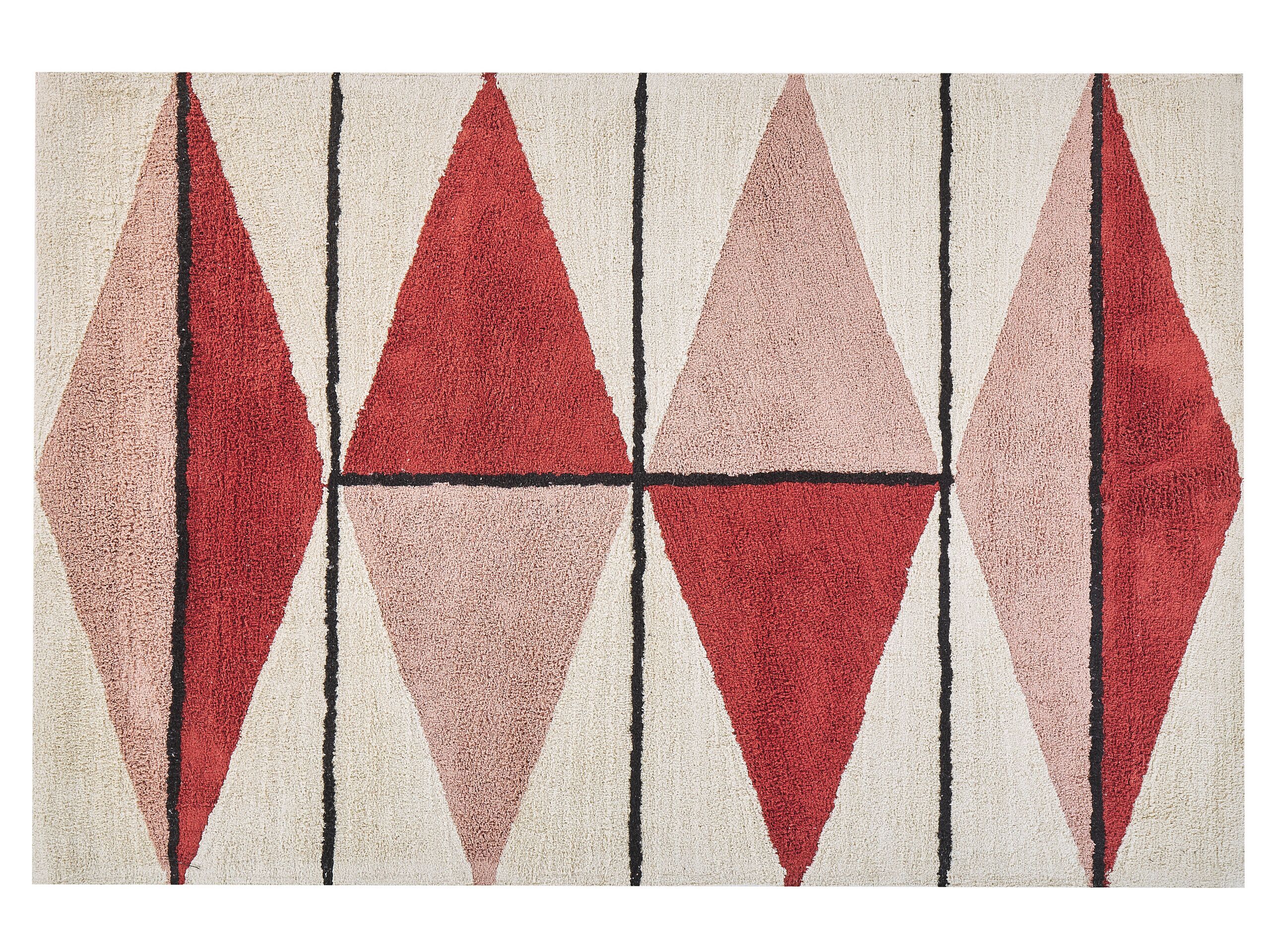This cotton area rug makes a splendid addition to any minimalist or retro setting. Its pile is made from soft cotton, characterized by its longevity and durability. The rug features a geometric pattern in beige, pink and red, which makes it a perfect fit for any living room, bedroom or hallway. The piece comes with a cotton underlay, so it is suitable for underfloor heating. Details: Color: Multicolour, Black, Red, Beige, Pink. Main material: Cotton. Material Composition: 100% Cotton Weight: 7 Assembly: Does Not Require Assembly